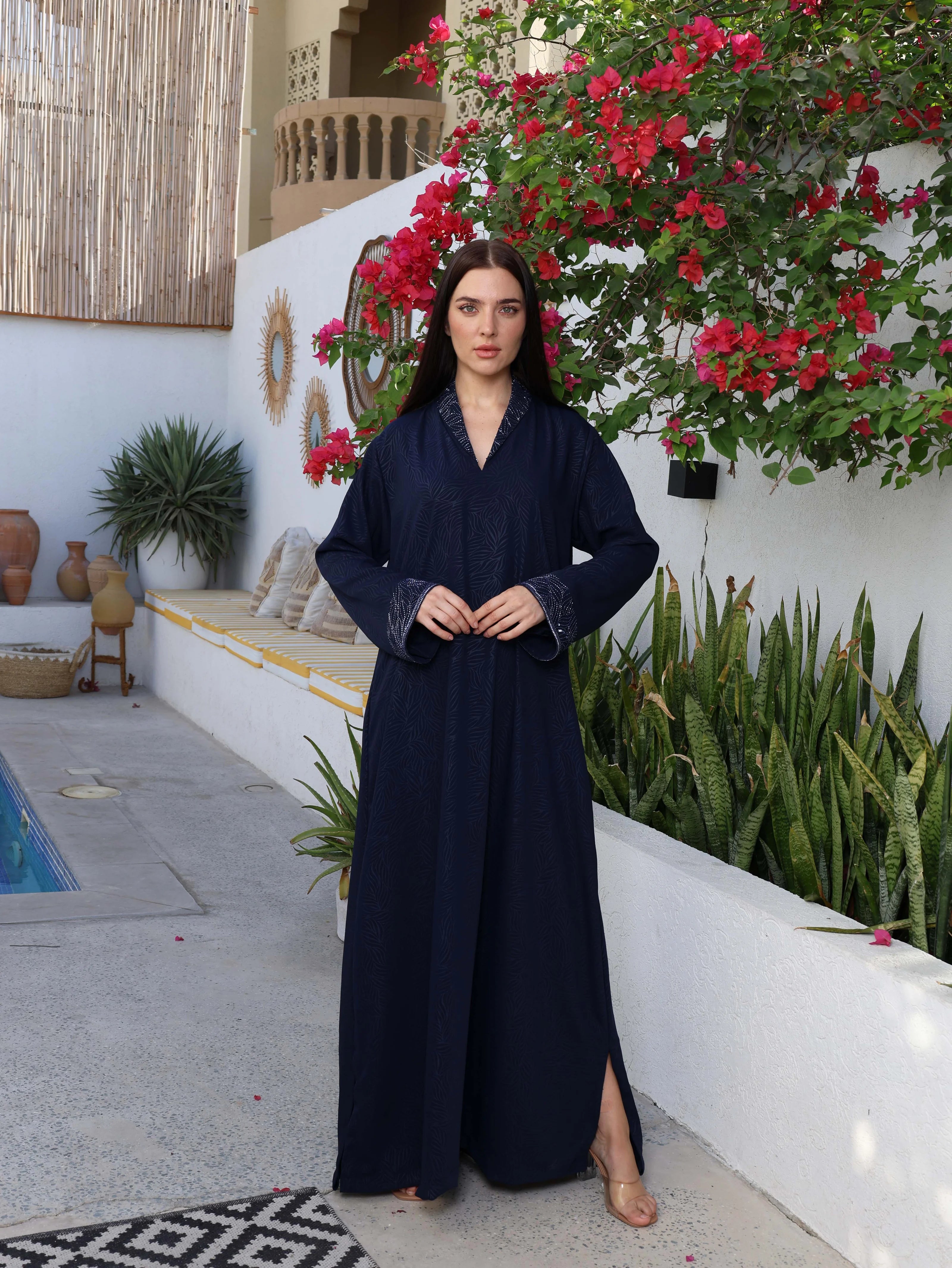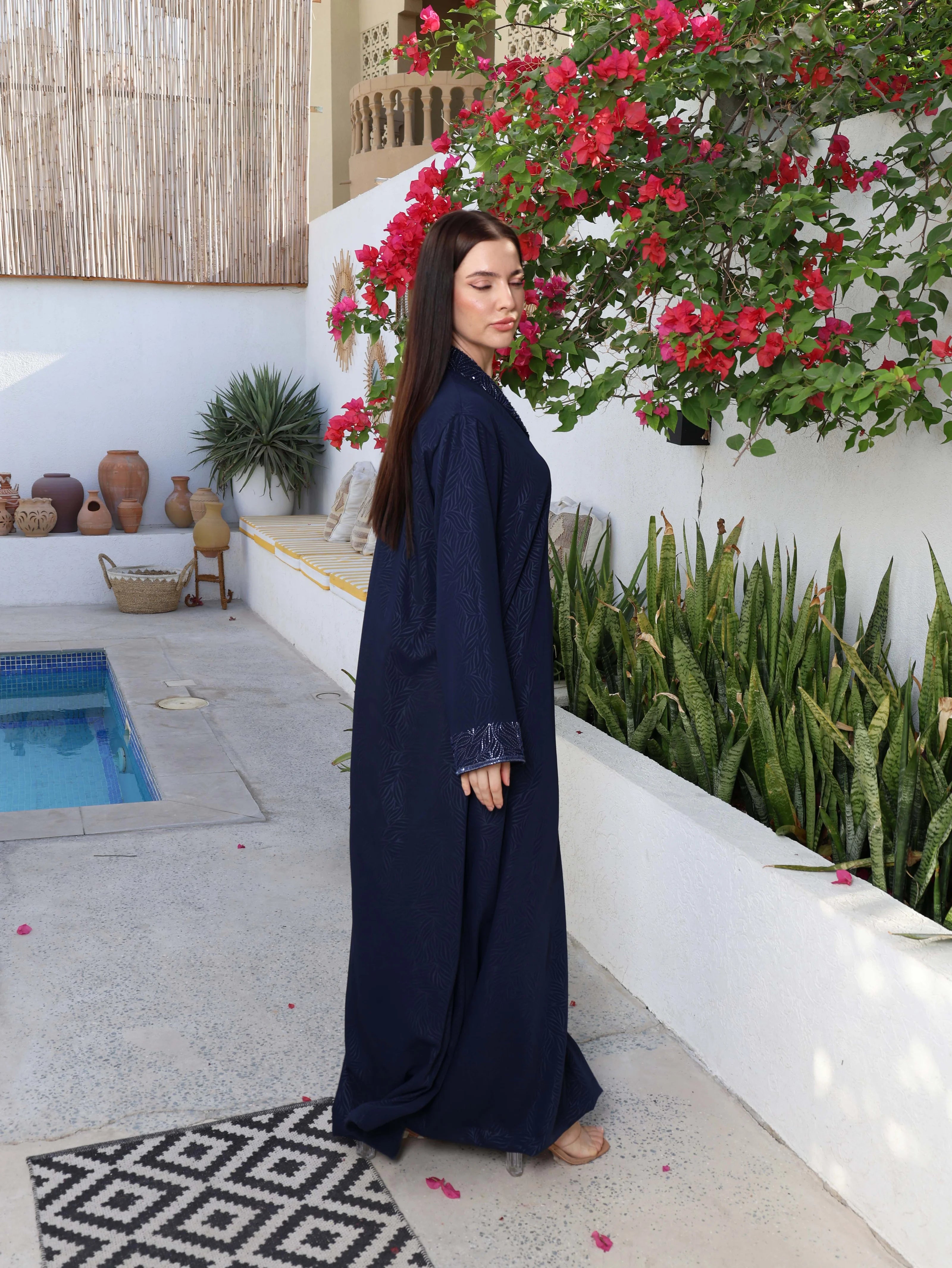 Embrace understated elegance with our Azraq Elegance Jalabiya, beautifully tailored from premium Alika emboss fabric that adds a subtle textured sheen to the deep navy hue. The refined design features delicate embellished detailing along the neckline and cuffs, adding a graceful sparkle to its timeless silhouette.