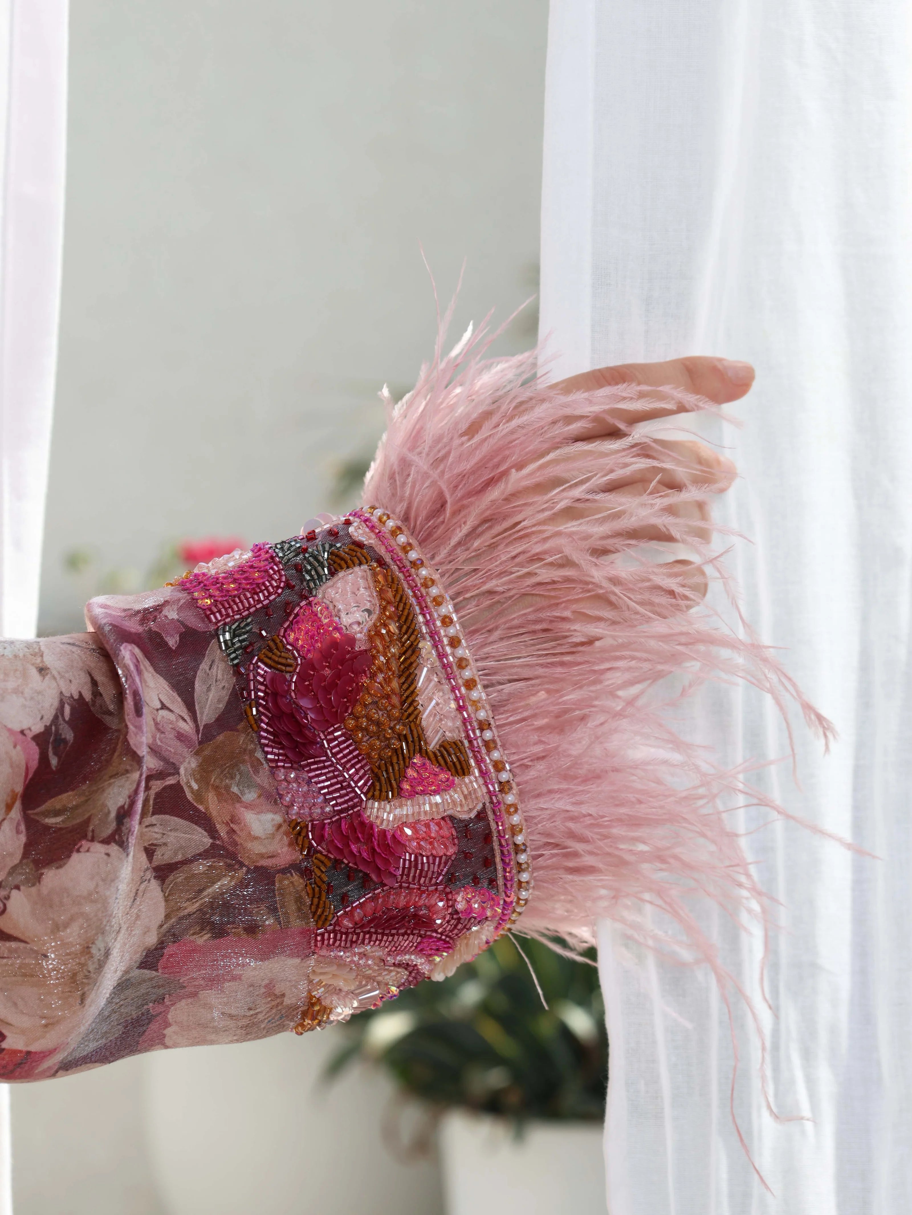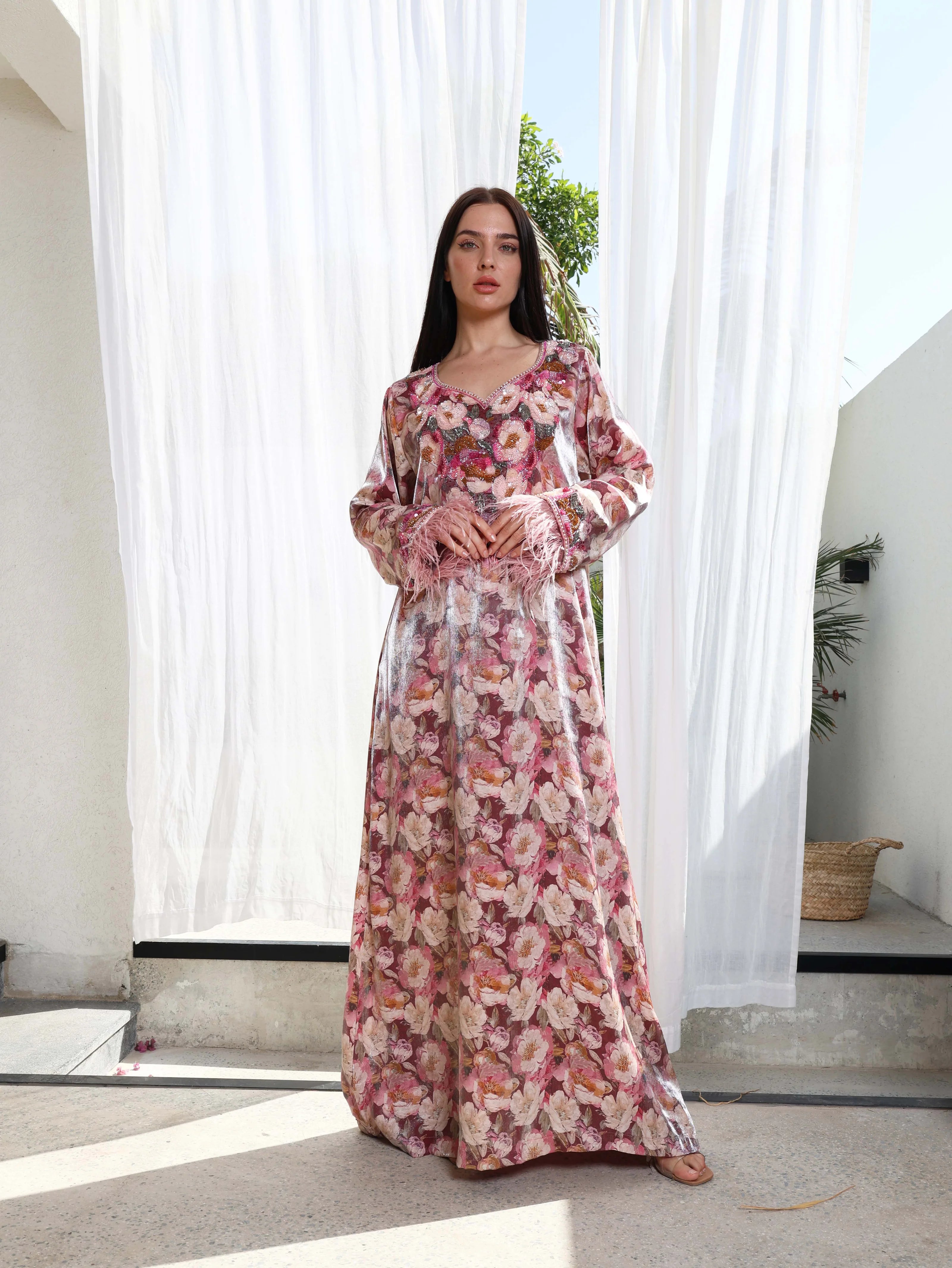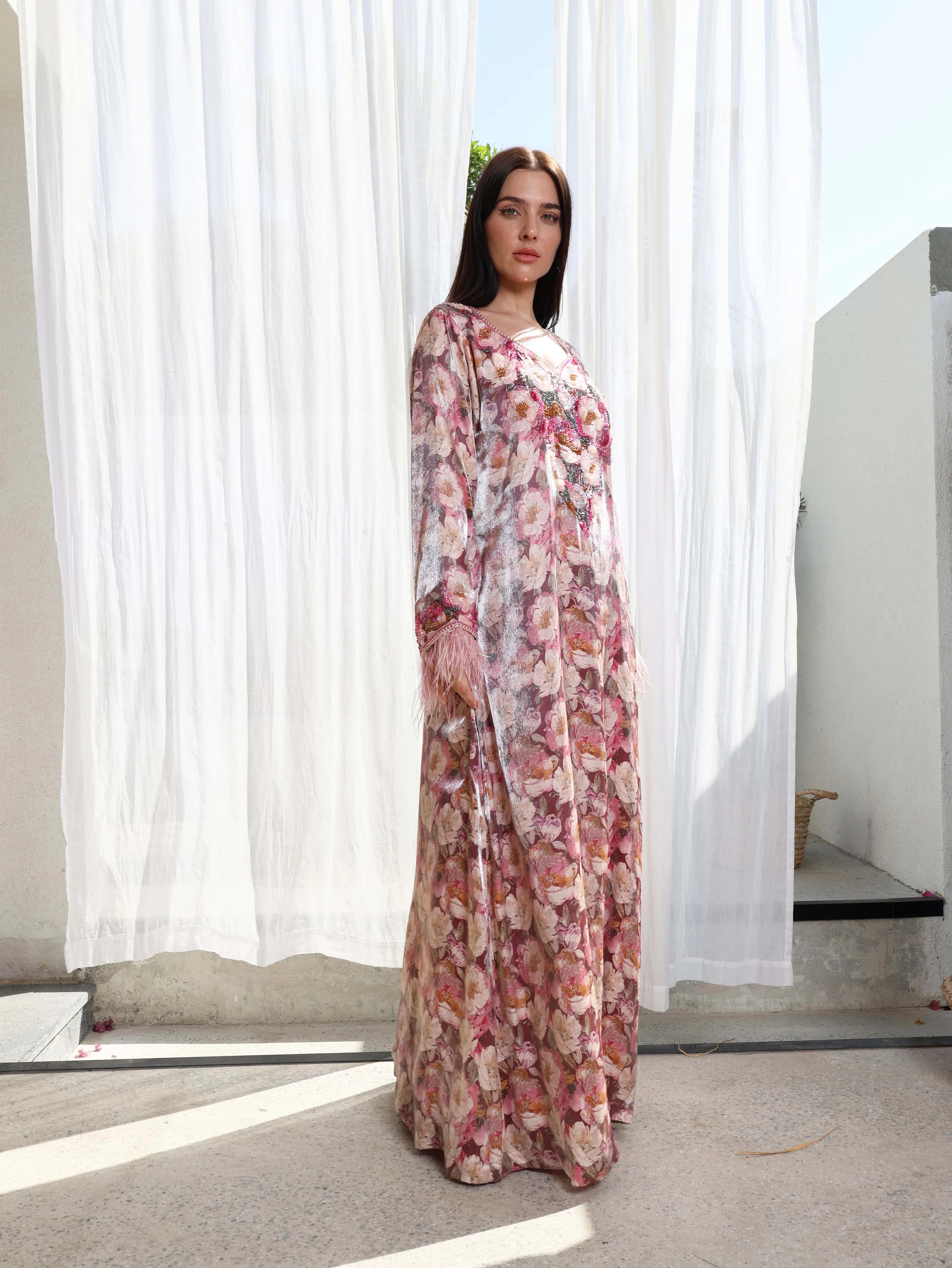 Shine with sophistication in our Blush Shimmer Jalabiya, crafted from elegant shimmer fabric that catches the light with every movement. The soft rose and blush floral pattern brings a romantic charm, beautifully enhanced with hand-embellished beadwork across the neckline and cuffs.