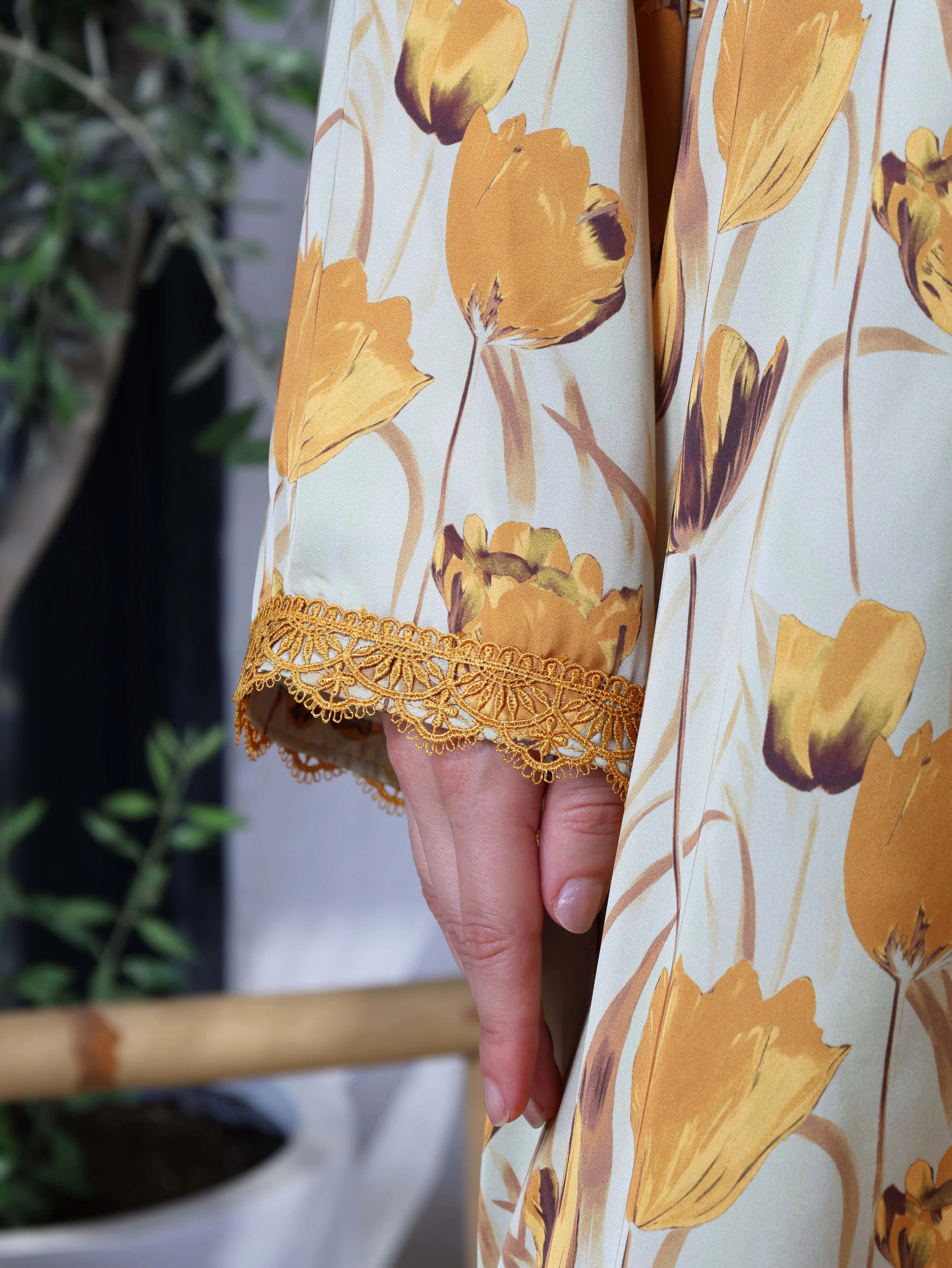 Radiate sophistication in our Golden Tulip Jalabiya, crafted from luxurious mango fabric for a smooth, breathable, and elegant drape. The soft ivory base is adorned with golden tulip prints, creating a timeless floral charm that exudes warmth and refinement.