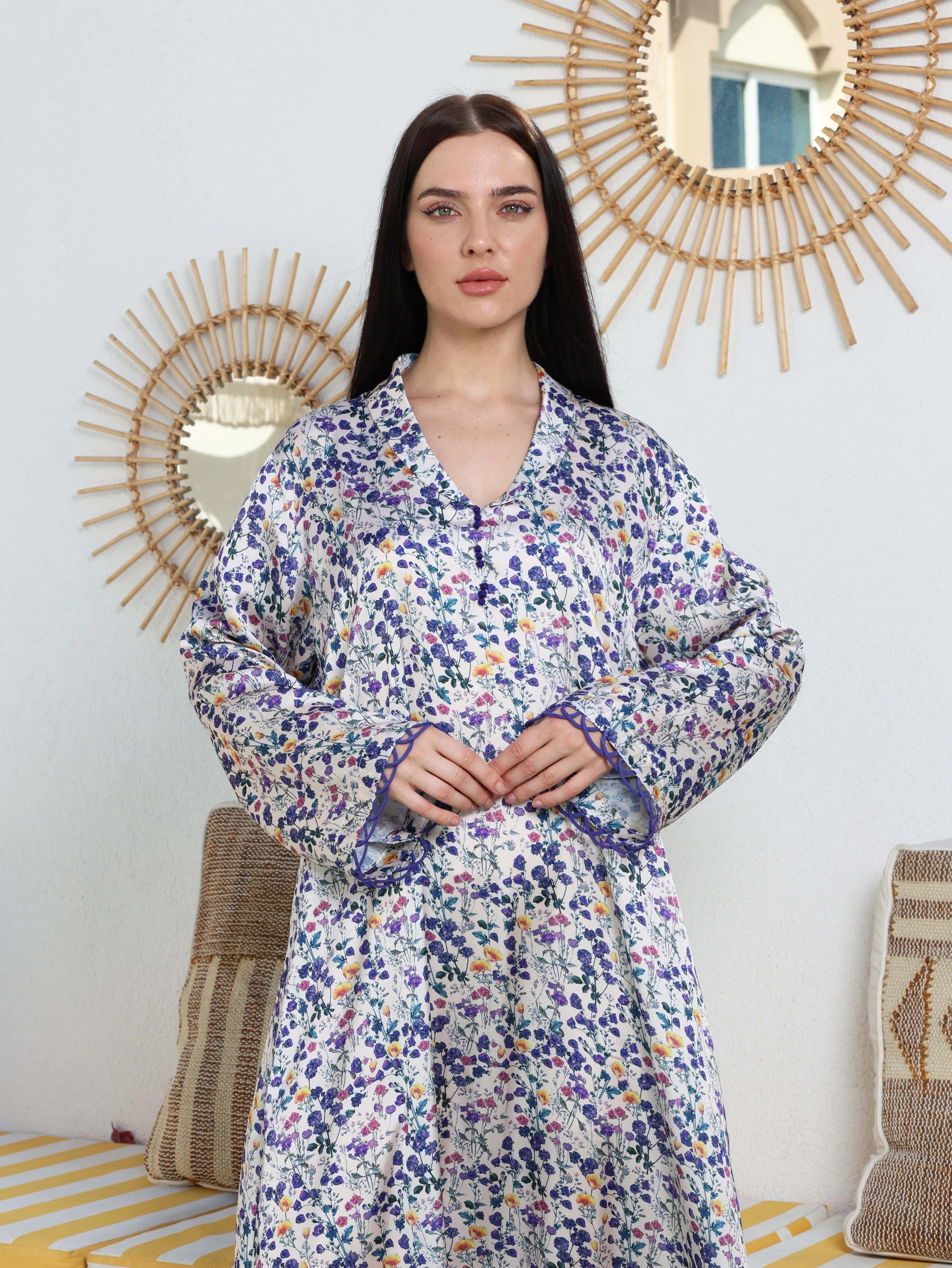 Breeze through your day in our Lavender Meadow Jalabiya, crafted from premium mango fabric featuring a soft floral print in shades of lavender, yellow, and blue. This piece is designed in a medium size with a 58-inch length, offering an elegant and relaxed silhouette. The look is finished with delicate purple lace detailing on the neckline and sleeves for a subtle, feminine touch.