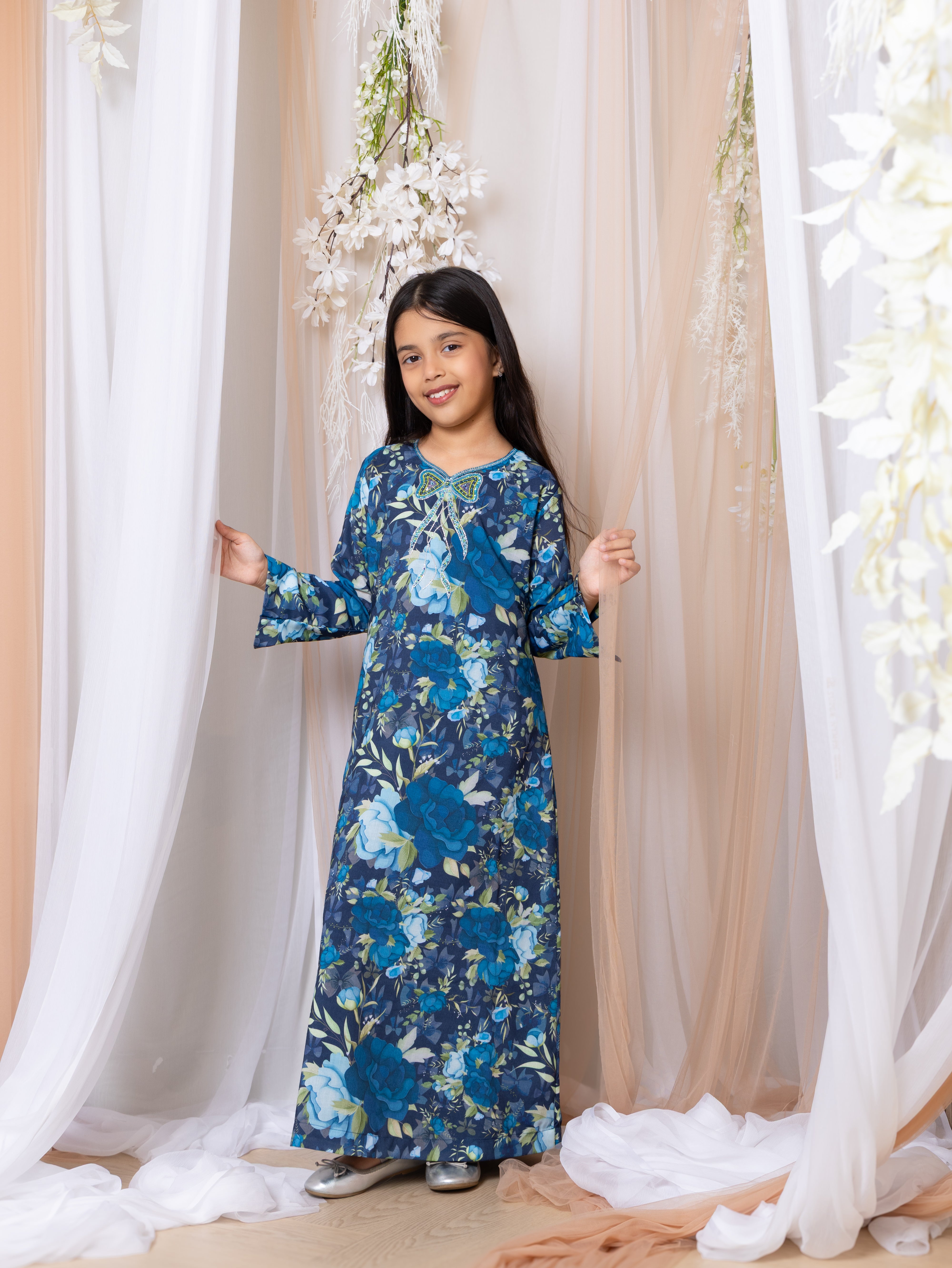 The Mini Bow Line - Plum Edition Dress features a rich berry-toned floral print inspired by evening gardens and soft autumn blooms. Hints of rose, mauve, and warm amber dance across a deep plum base, creating a look that is both elegant and expressive. The neckline is detailed with a hand-embroidered bow, adding a refined artisanal touch, while the sleeve slits bring graceful movement to the silhouette. Crafted in lightweight soft cotton blend with a soft inner lining, the dress offers comfort, coverage, and a beautiful drape, it is a modest yet feminine piece perfect for day-to-evening wear.