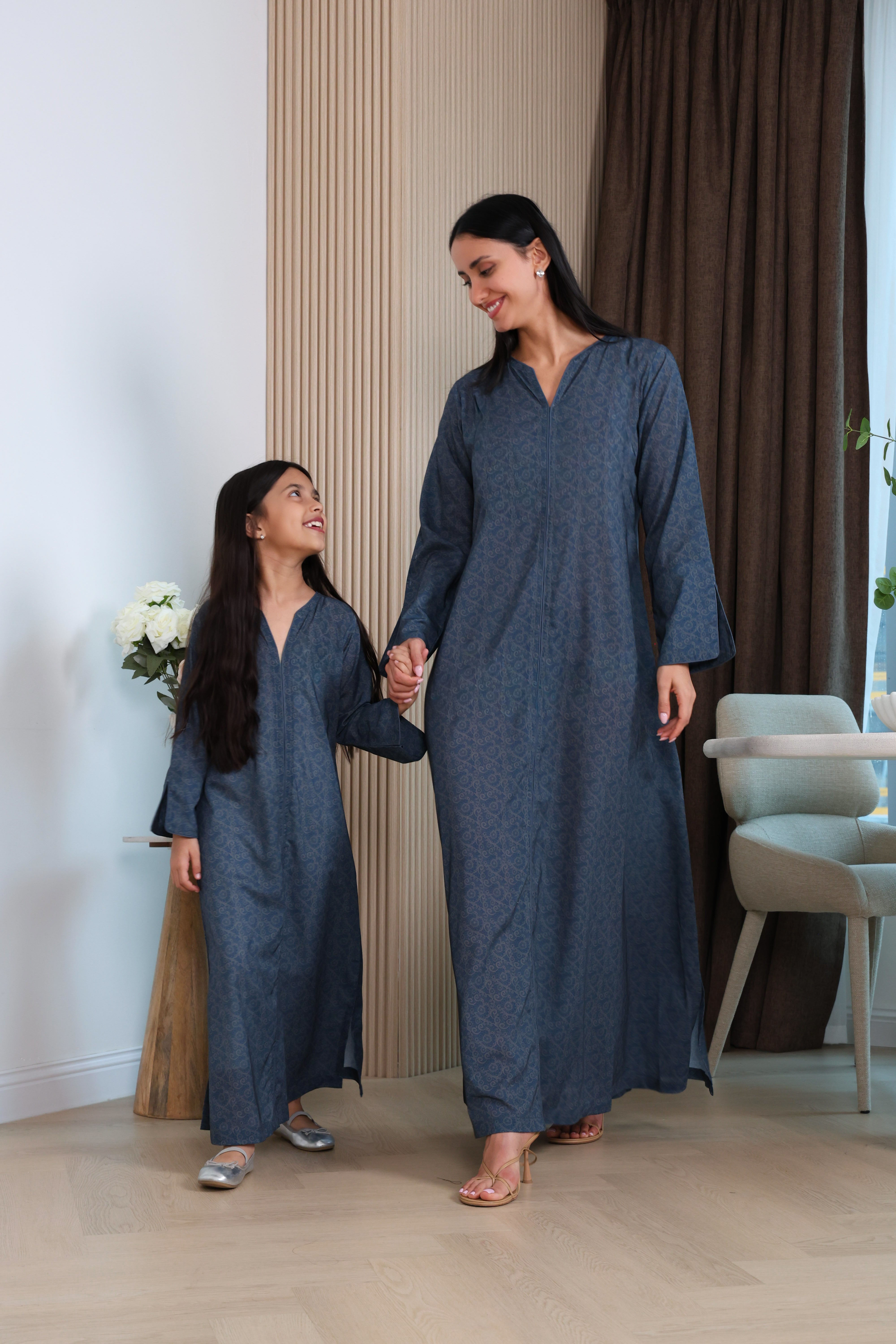 The Dusky Indigo Dress is crafted in a deep blue tone with a subtle intricate print inspired by vintage textiles and quiet evening skies. The centre front is finished with delicate piping work, adding gentle structure to the flowing silhouette, while the sleeve slits allow graceful movement and ease. Made in soft polyvoile, the dress offers a lightweight, breathable feel with a beautiful drape, it reflects effortless modest elegance.