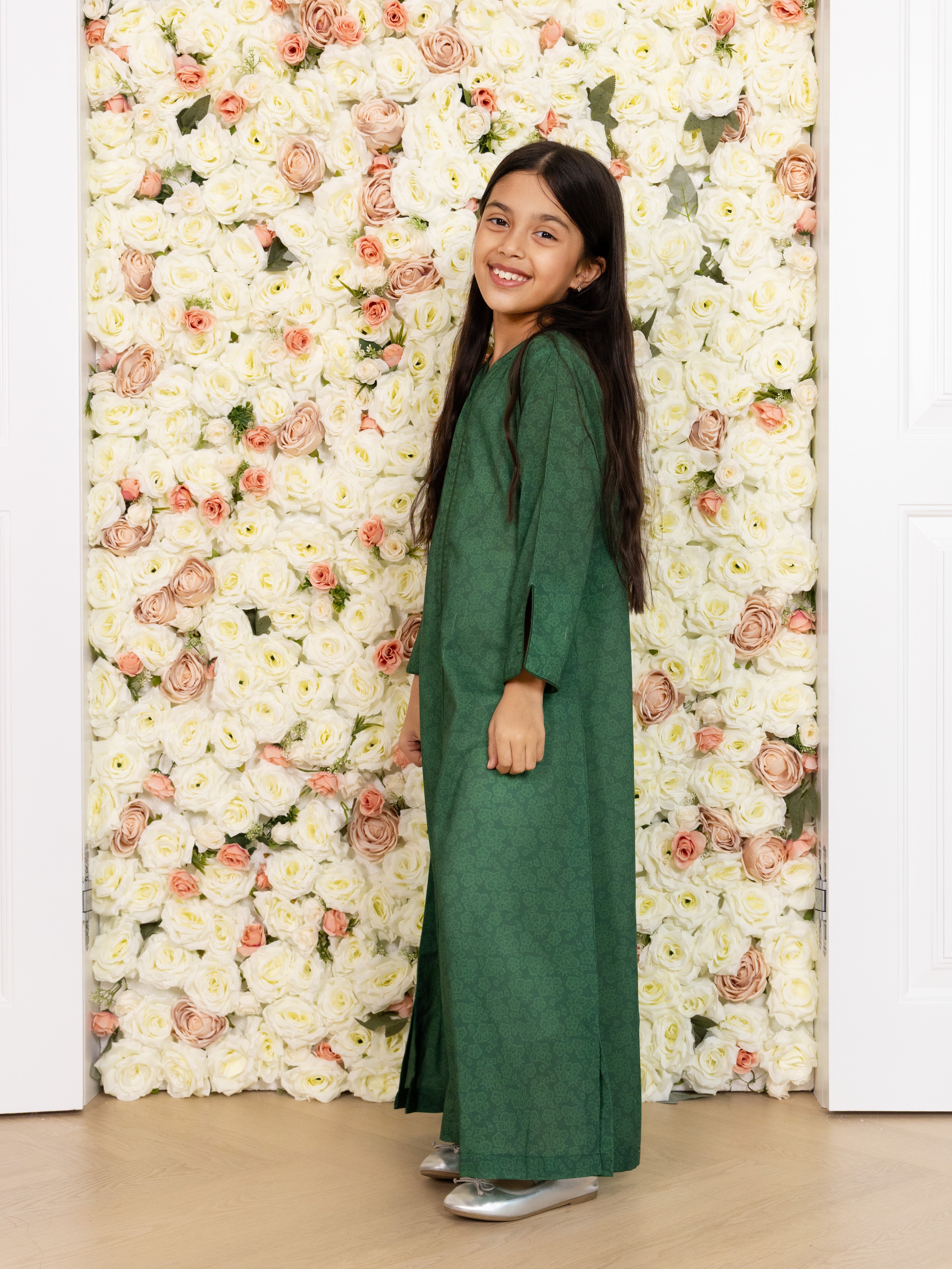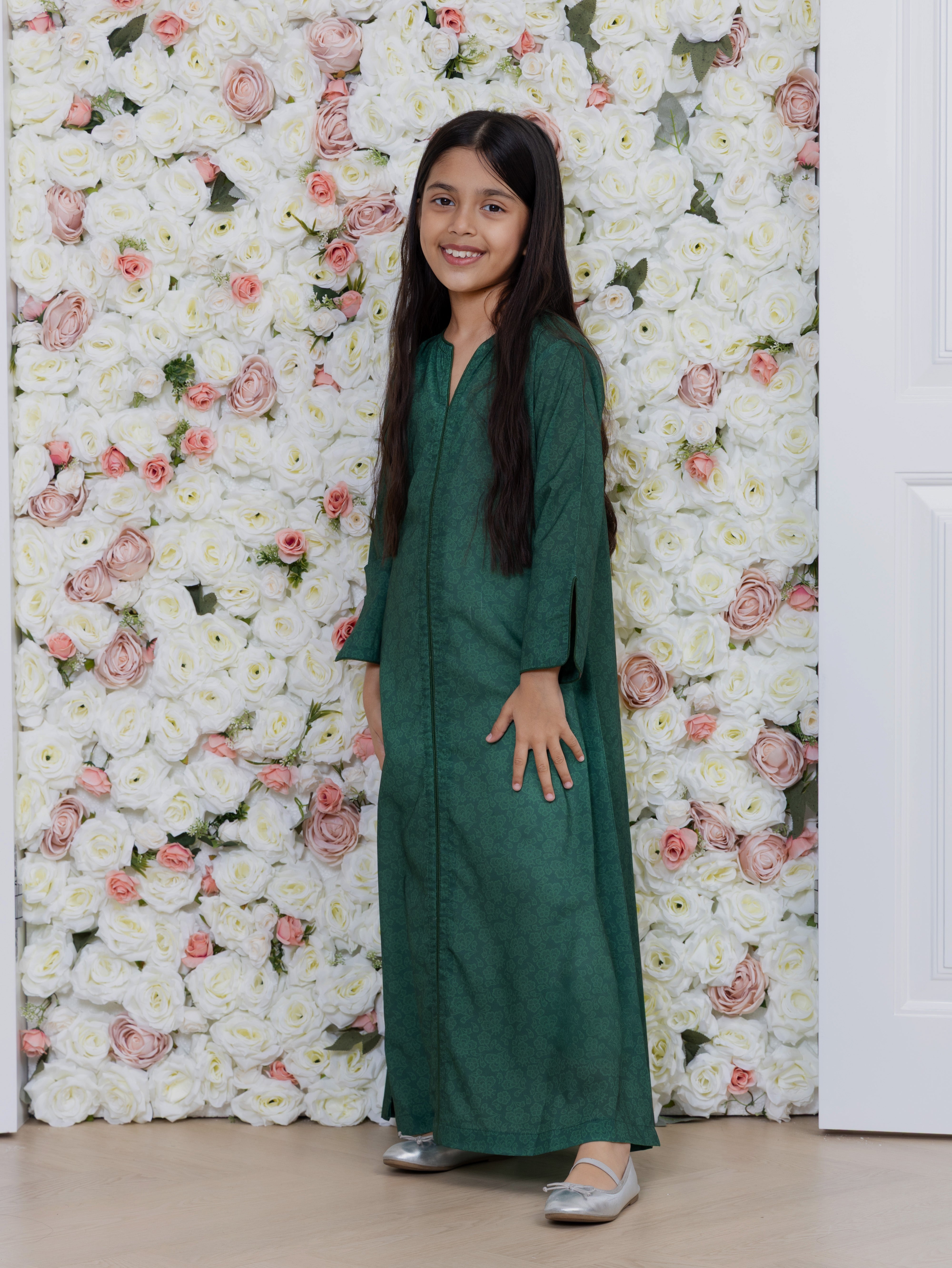 The Emerald Grove Dress is designed in a deep forest-green print inspired by quiet gardens and timeless natural textures. The subtle tonal pattern gives the fabric a refined depth, creating a look that is understated yet graceful. The centre front is finished with delicate piping work, adding structure and definition to the flowing silhouette, while the sleeve slits bring ease and gentle movement. Crafted in soft cotton blend, the dress offers a lightweight, breathable feel perfect for all-day wear, it reflects modern modesty with effortless elegance.