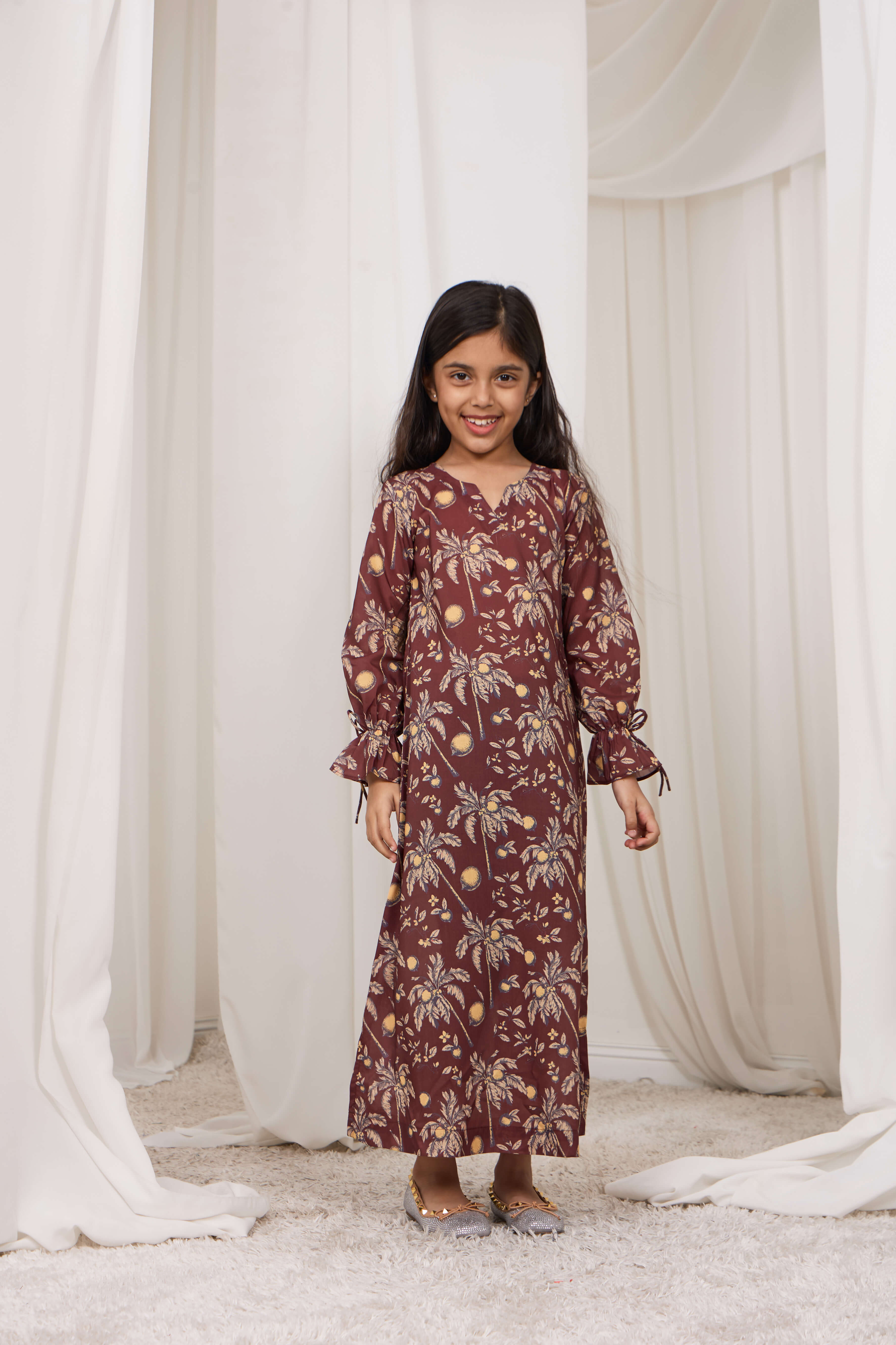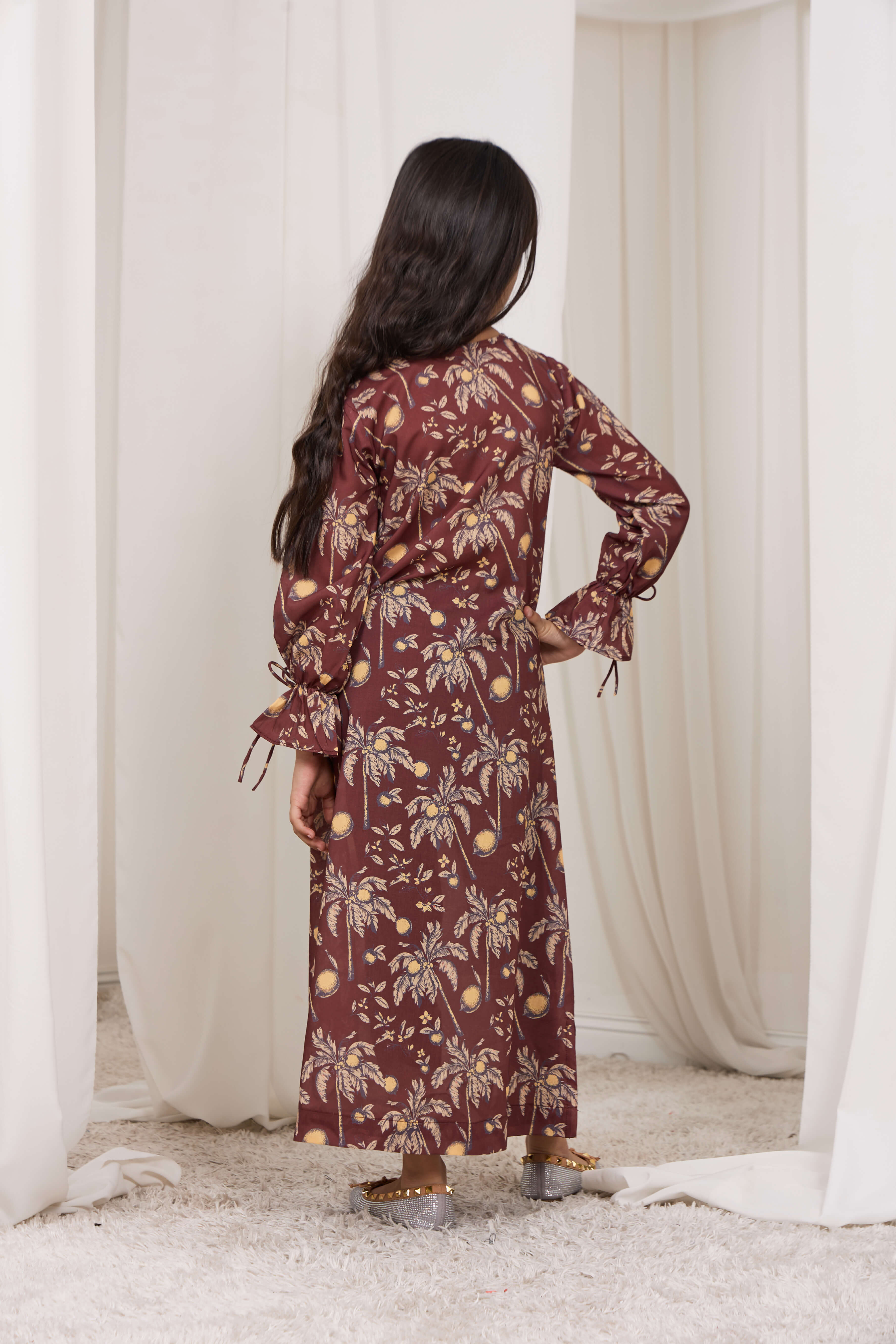 The Palm grace dress is a refined blend of elegance and comfort, designed for effortless everyday sophistication. Crafted in a rich earthy tone with a delicate botanical print, it features a flattering round V-neckline that maintains a modest appeal, long sleeves finished with puffy cuffs and feminine bow-tie details at the sleeve hem, and a subtle side slit at the lower hem for graceful movement. Designed in a medium size with a 39-inch length for an elegant & relaxed yet polished silhouette makes it perfect for day-to-evening wear, offering a timeless look that can be styled effortlessly with heels or flats for a chic, elevated finish.