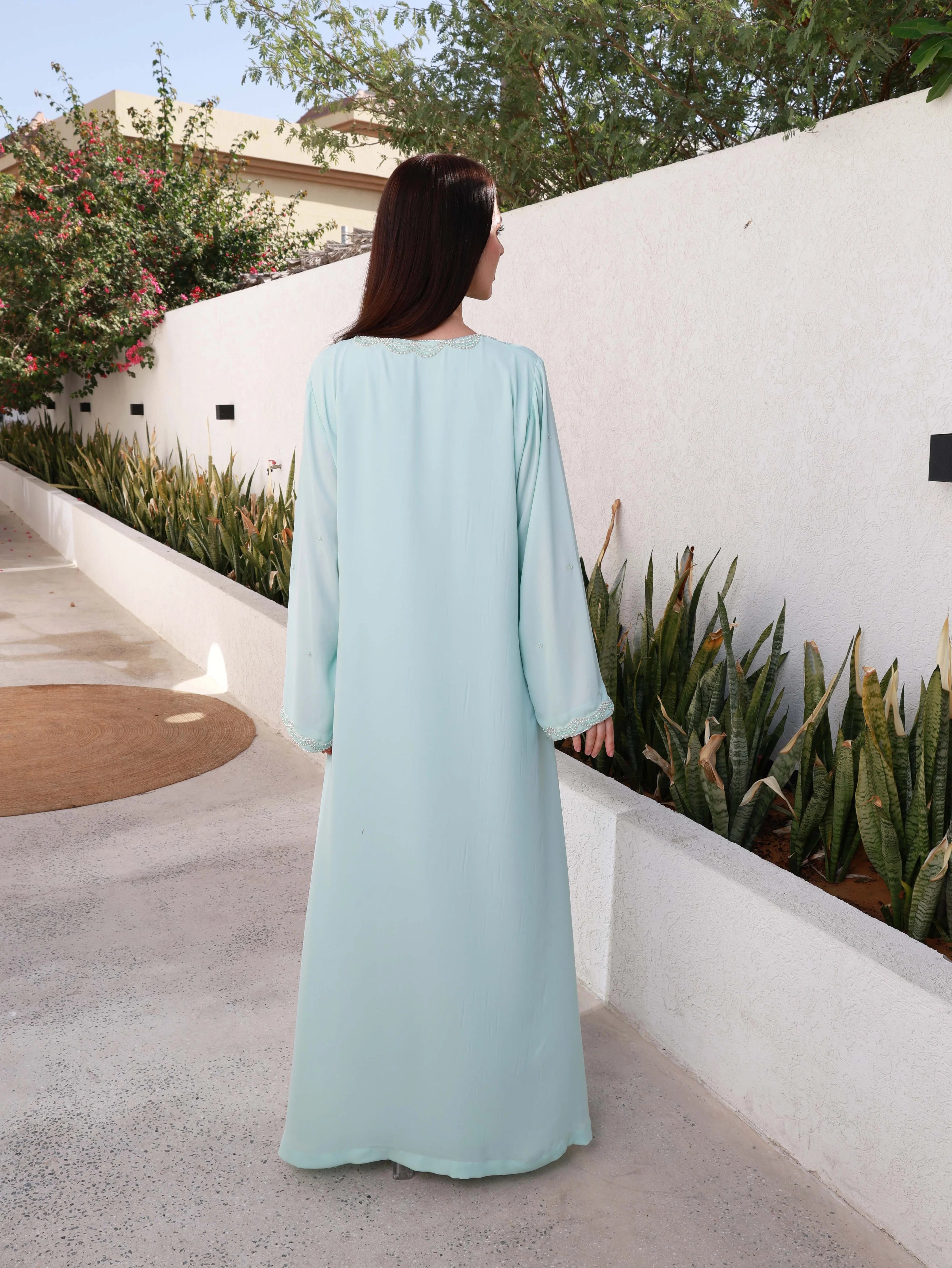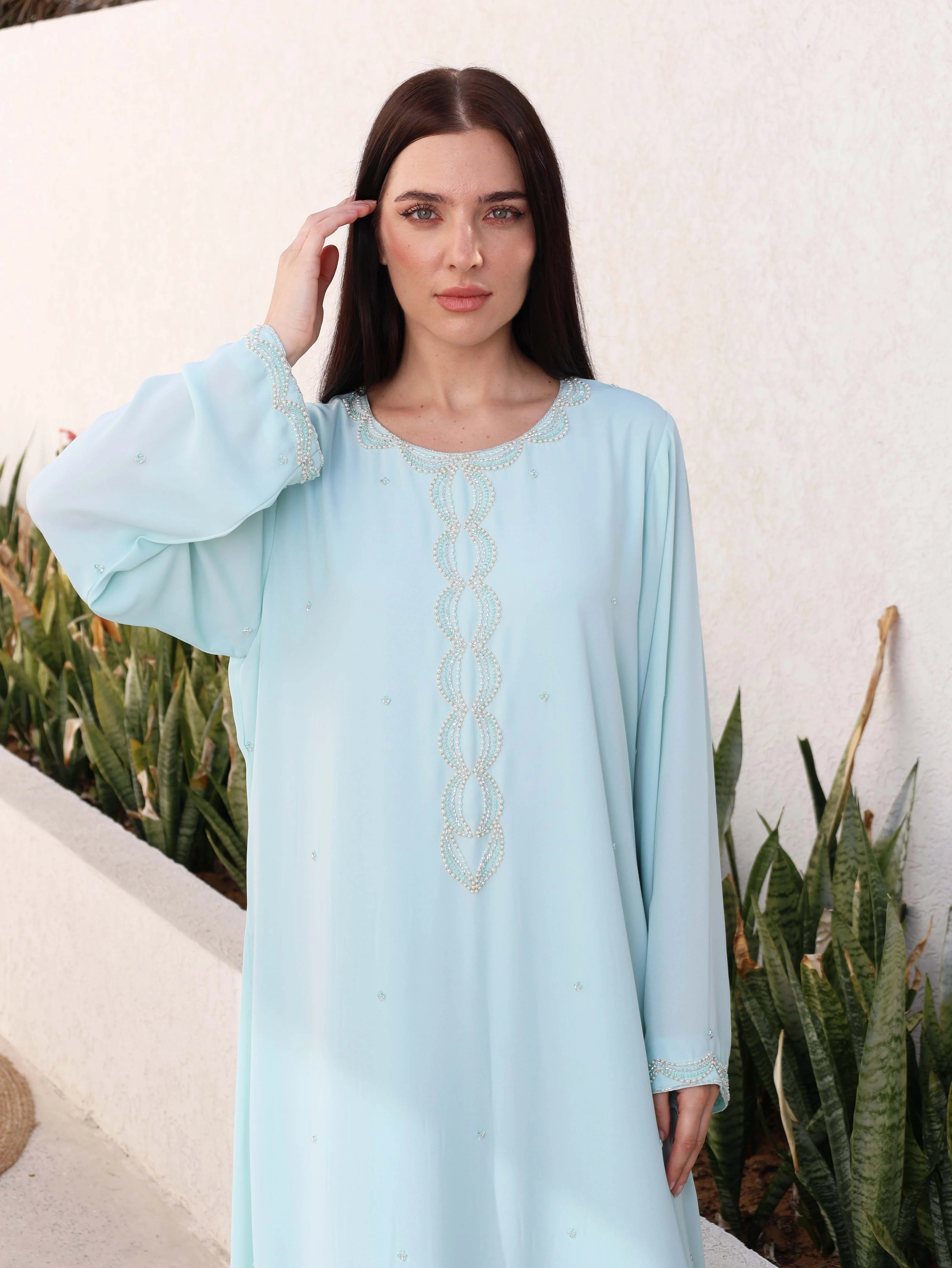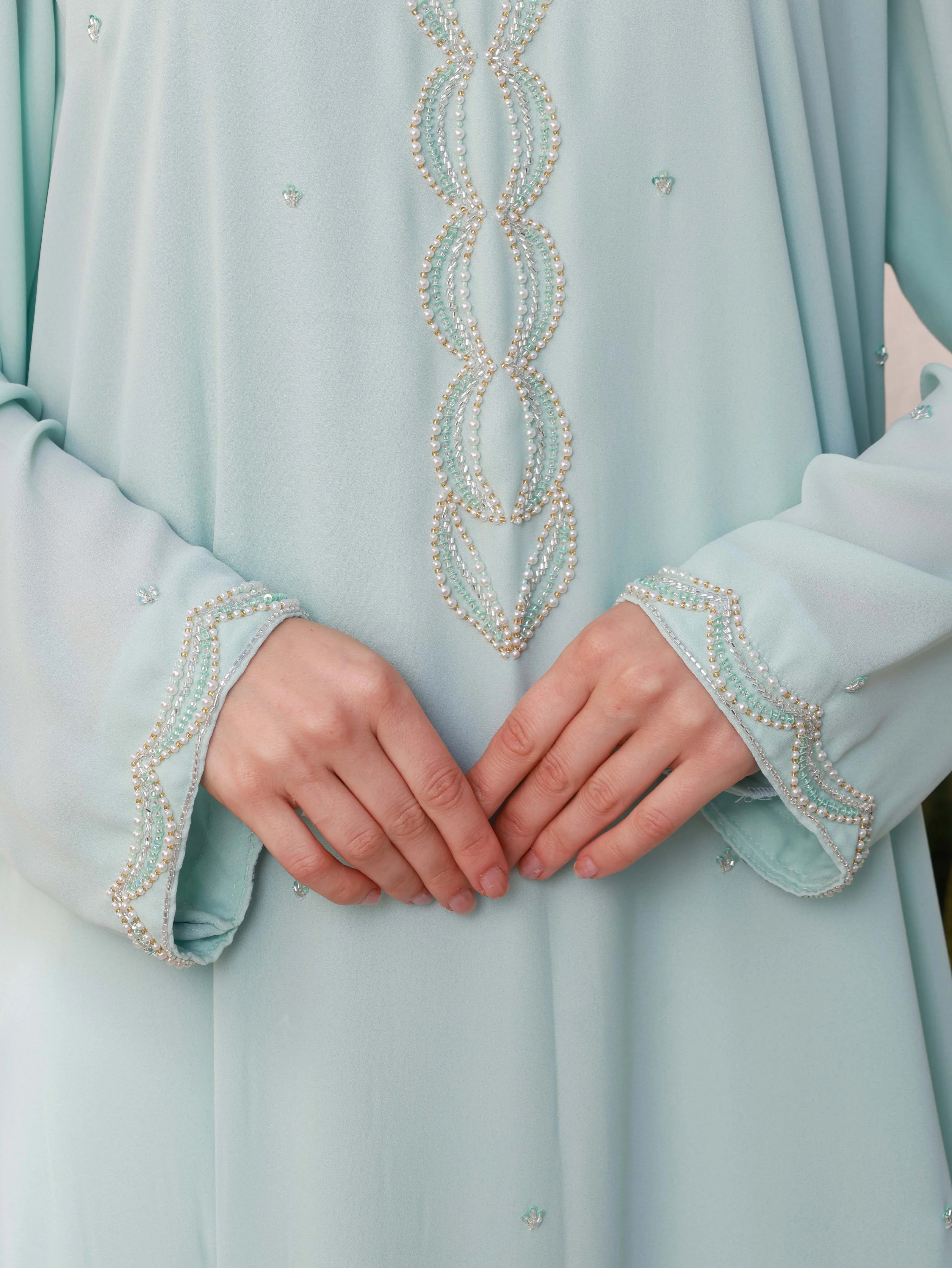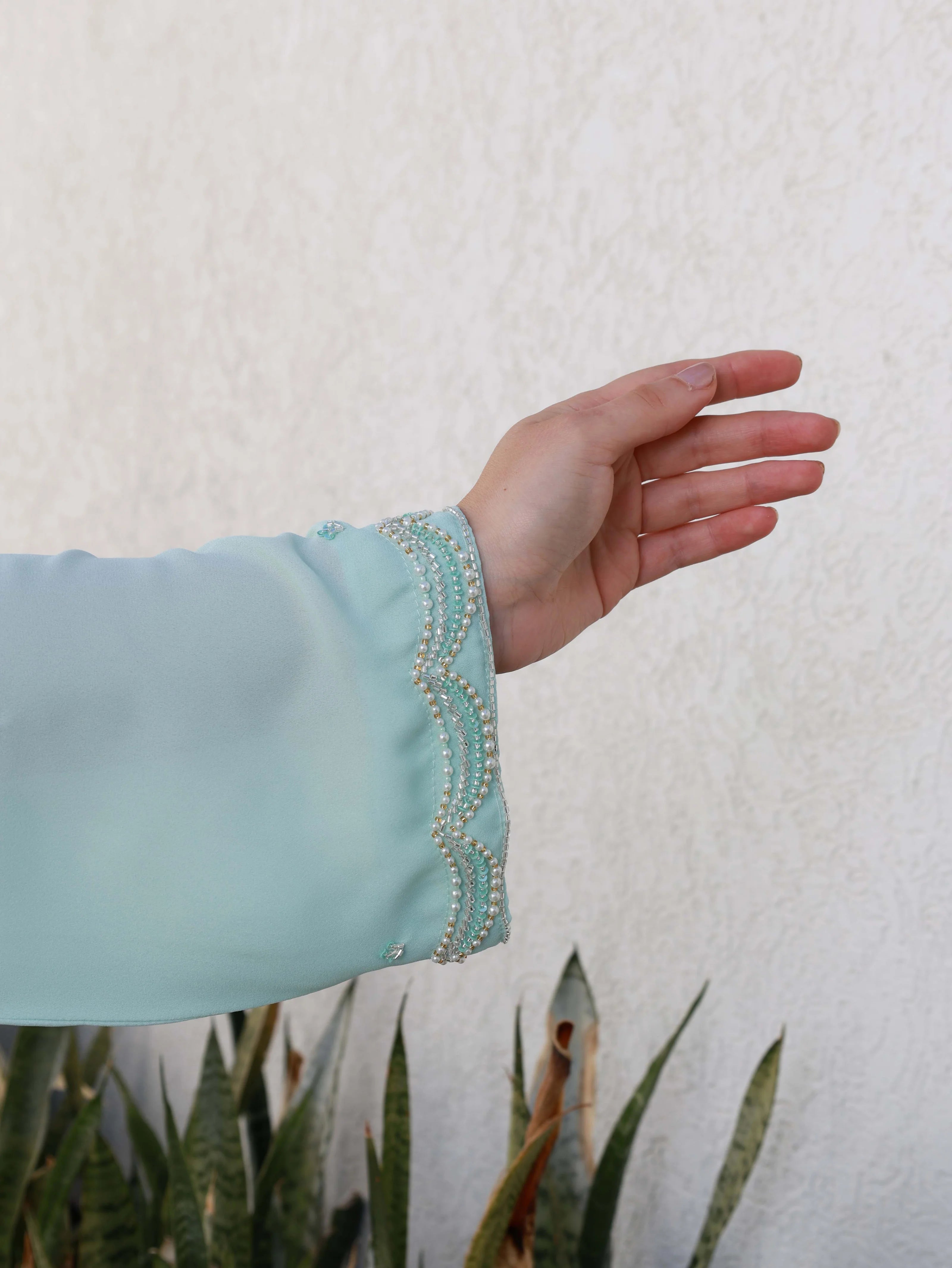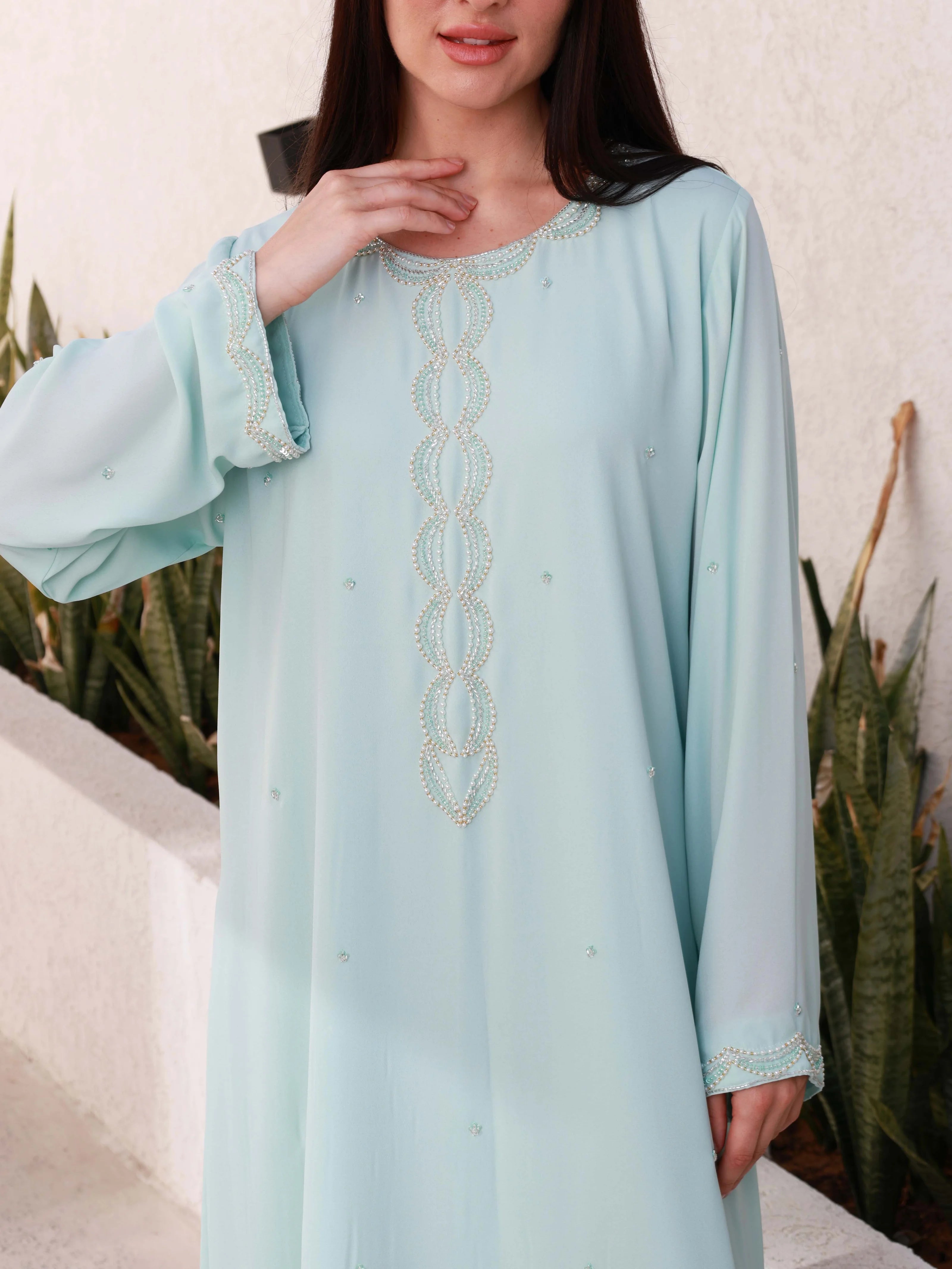 Radiate effortless grace in our Mint Pearl Jalabiya, beautifully crafted from premium Tiara fabric for a soft, flowy, and luxurious drape. The soothing mint hue exudes freshness and elegance, perfectly complemented by delicate pearl and bead embellishments along the neckline and cuffs.