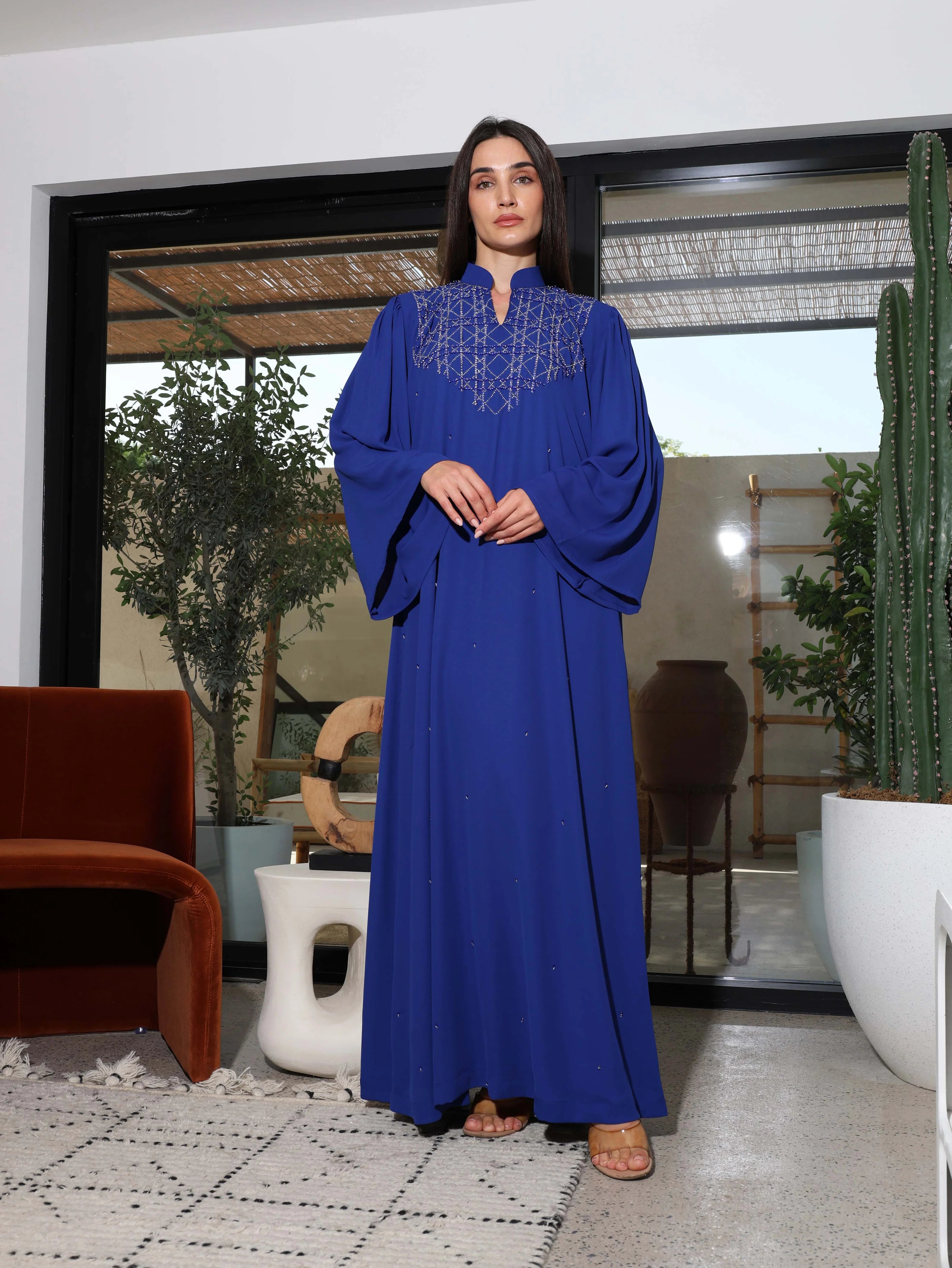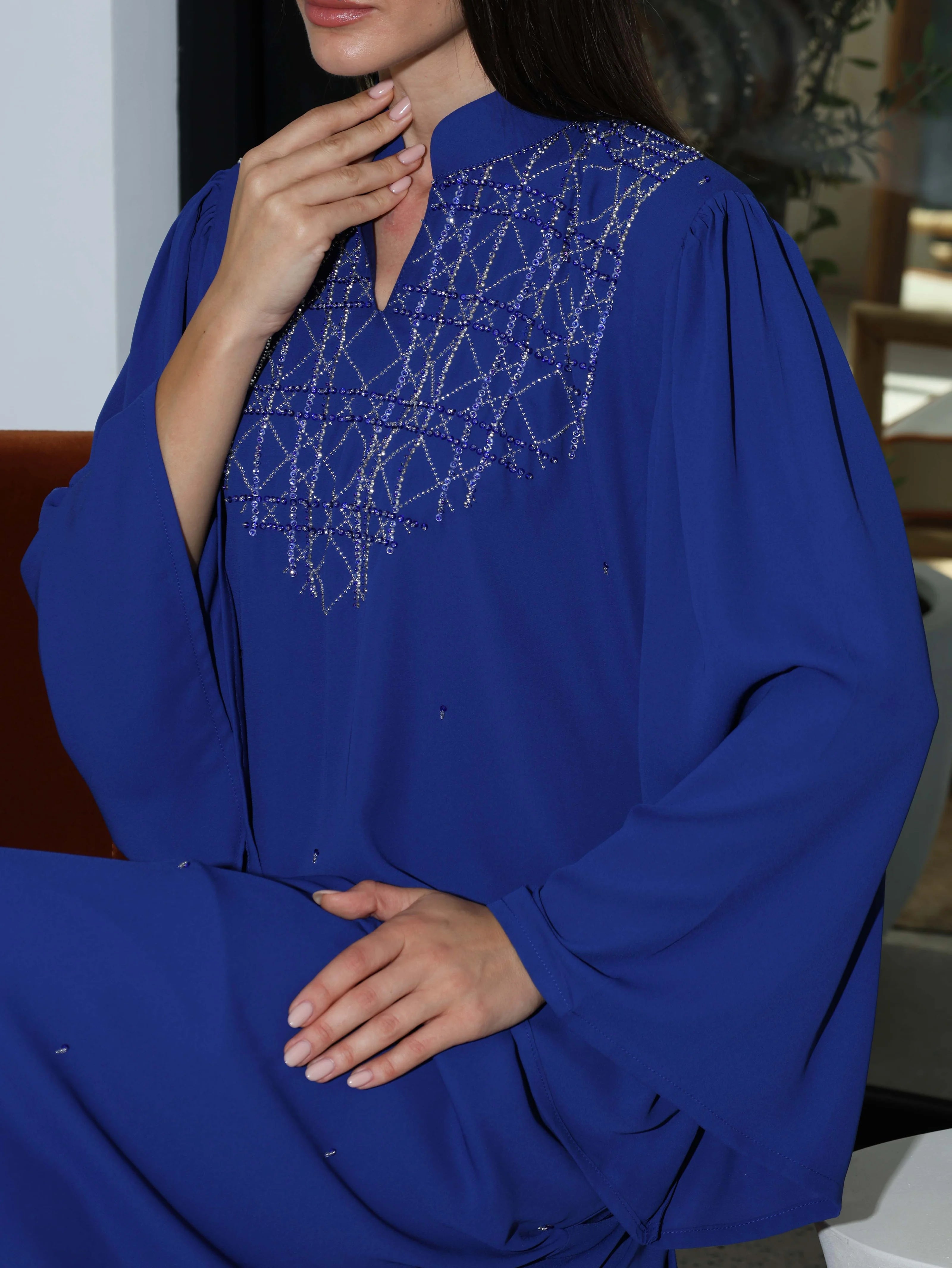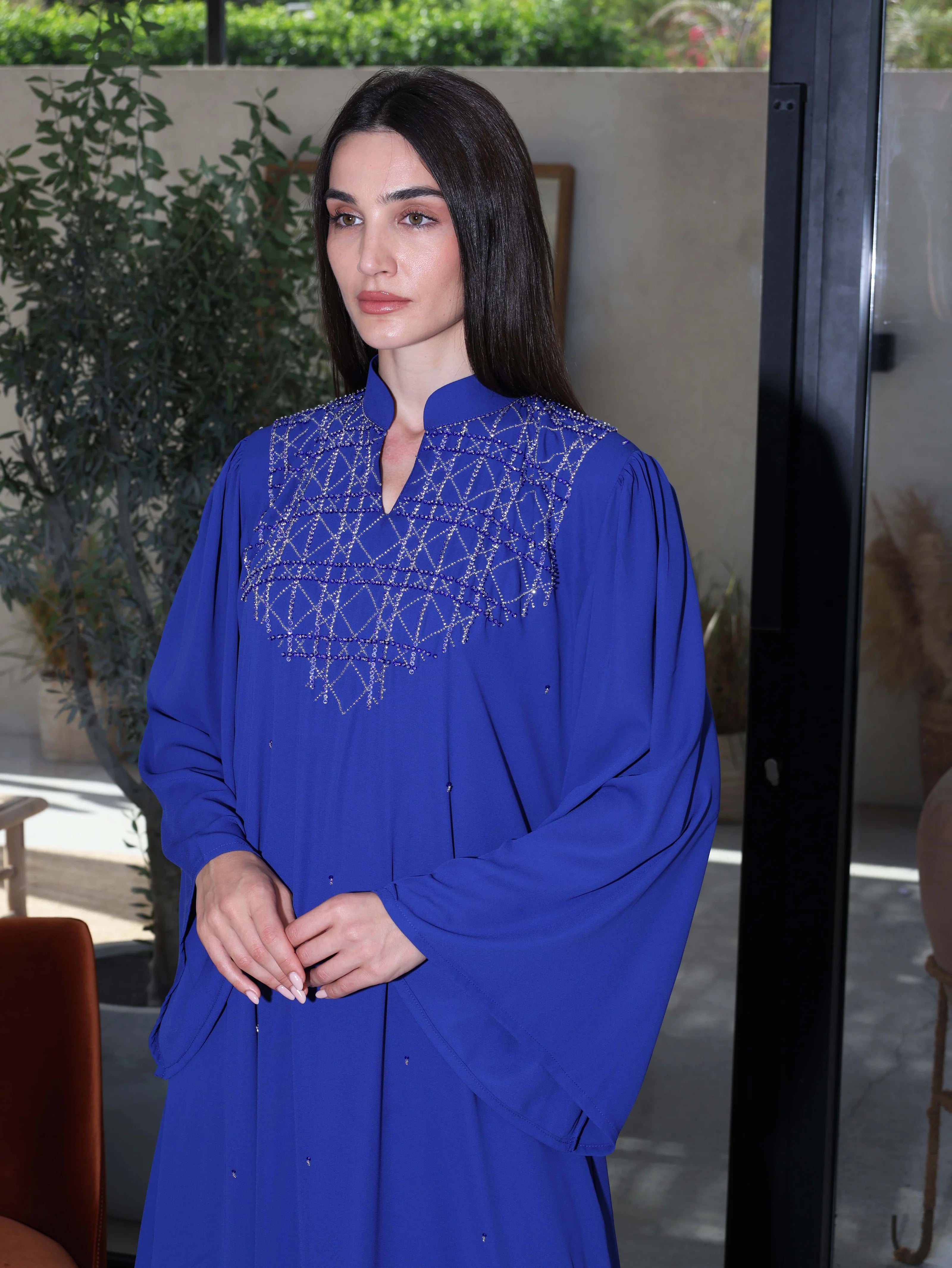 Step into sophistication with our Royal Azure Jalabiya, exquisitely tailored from luxurious Tiara fabric that offers a soft, flowy drape and a regal finish. The rich cobalt blue tone is elevated with intricate hand embellishments across the neckline and shoulders, adding subtle sparkle and depth to this statement piece.