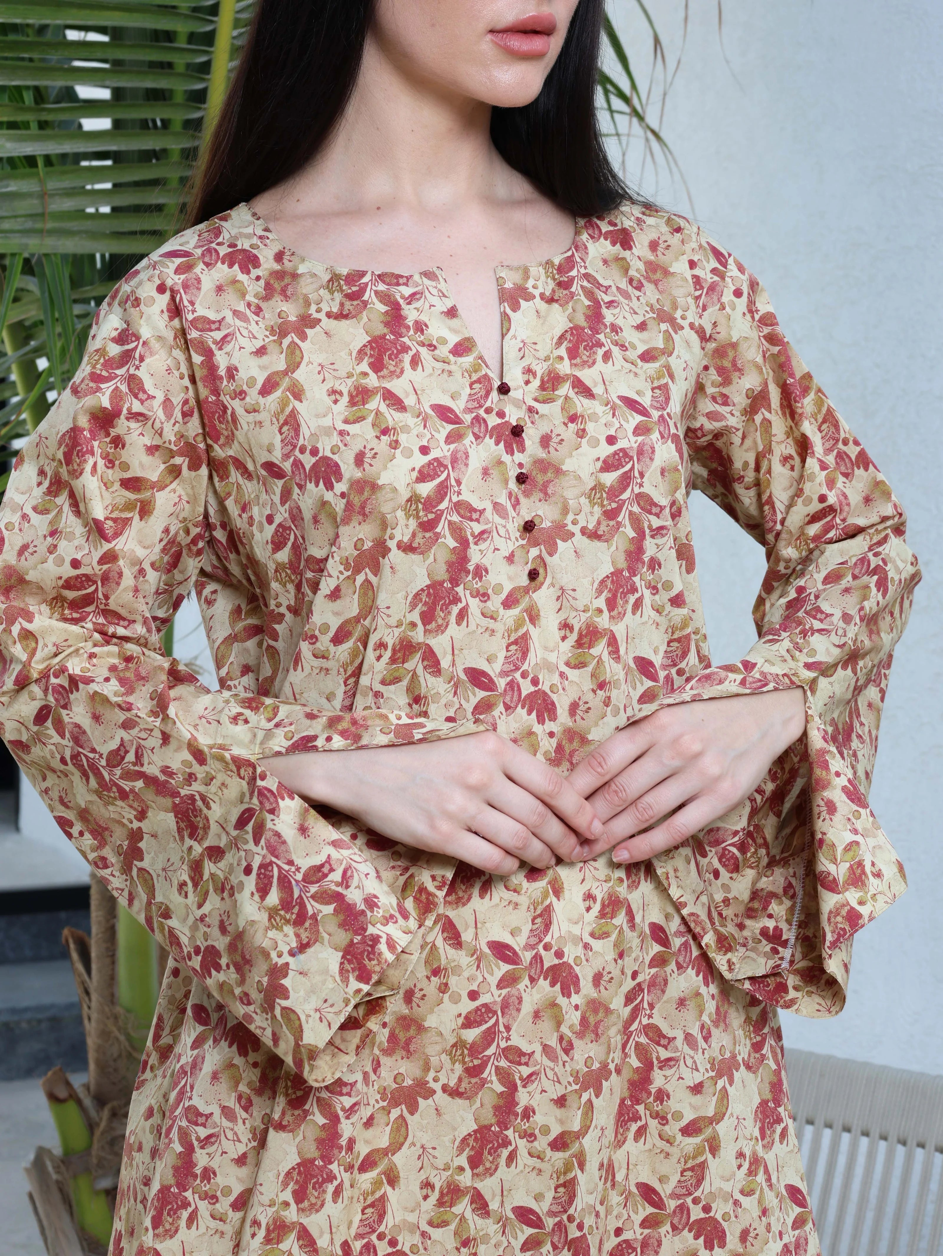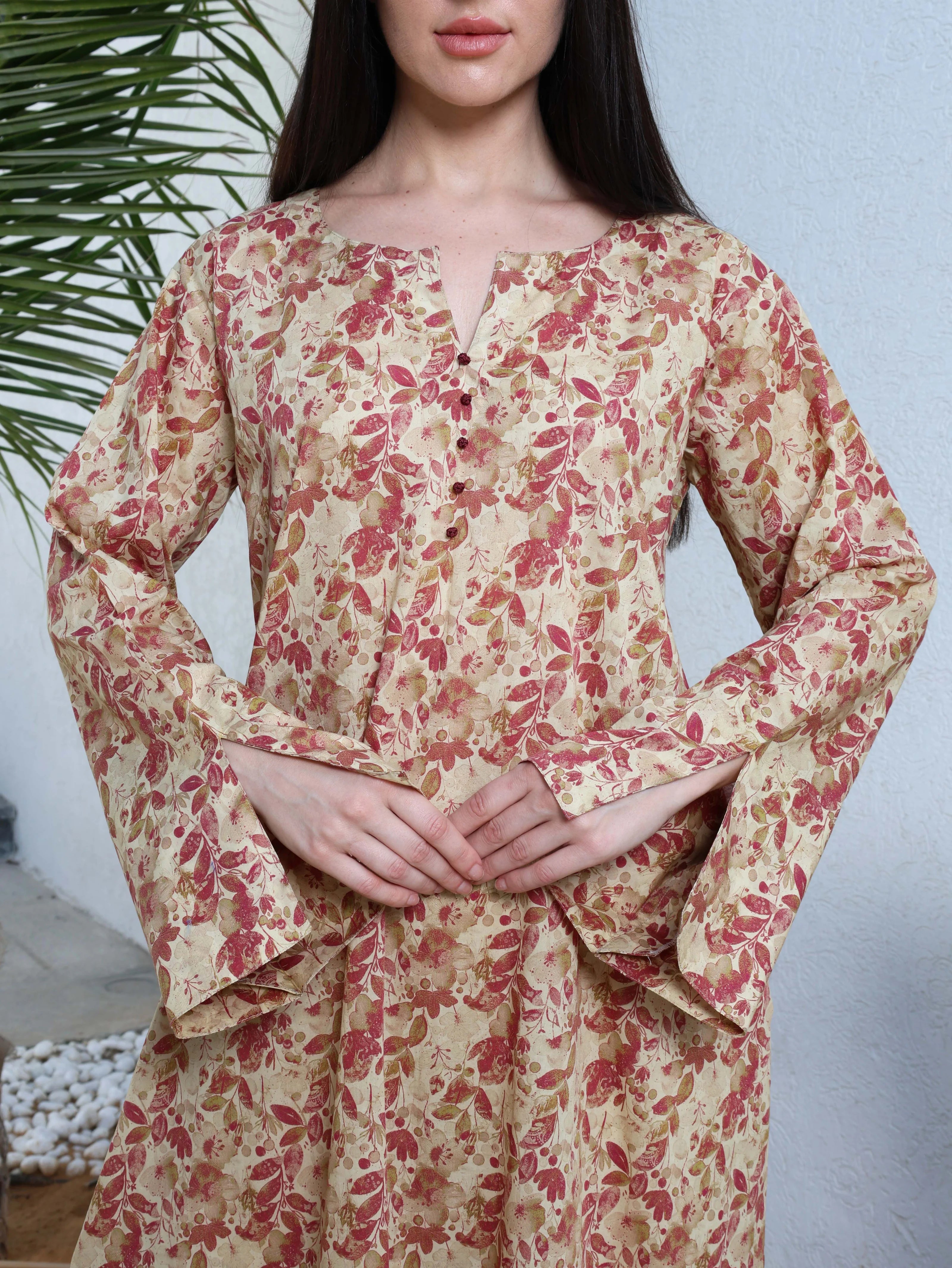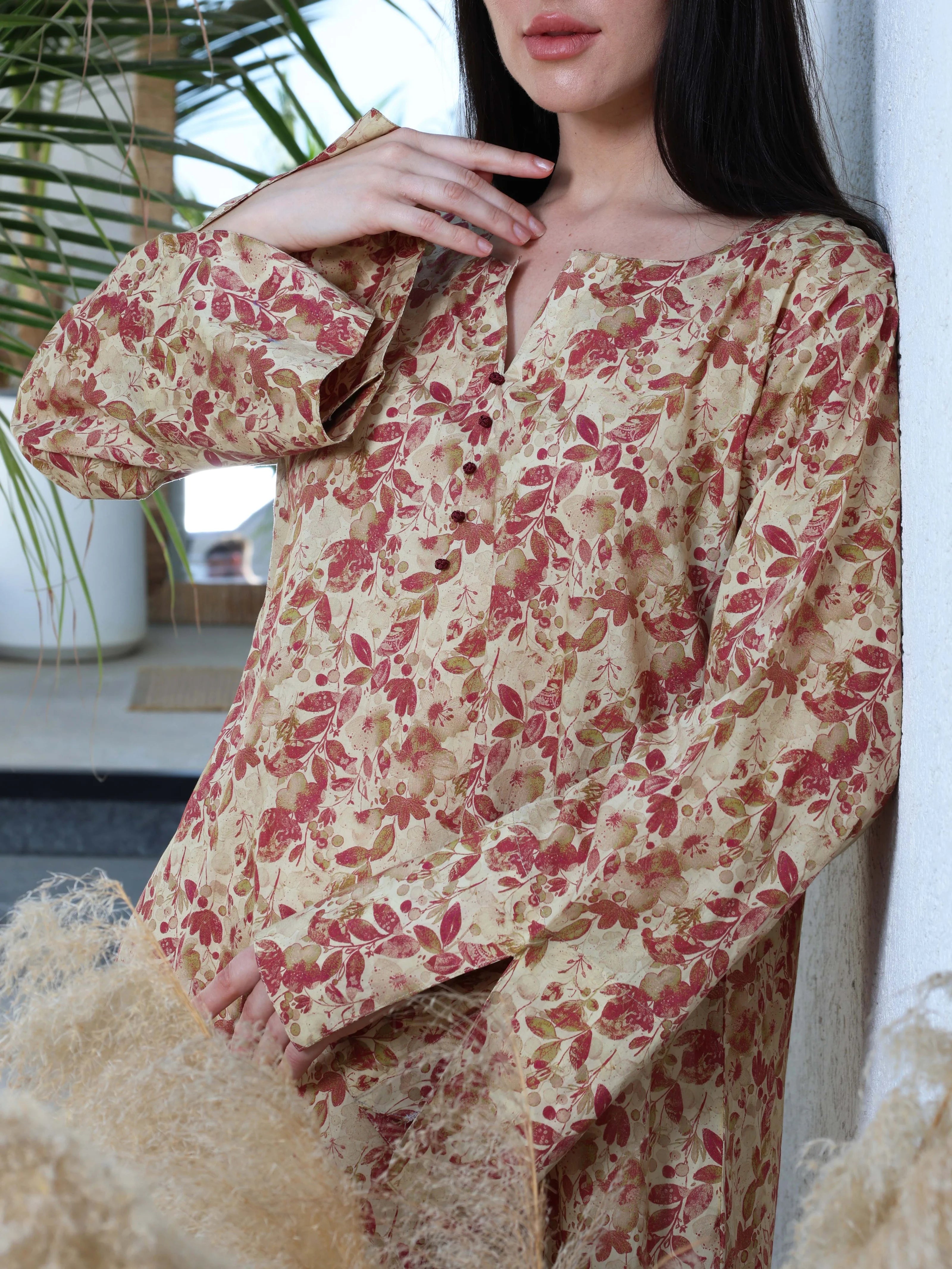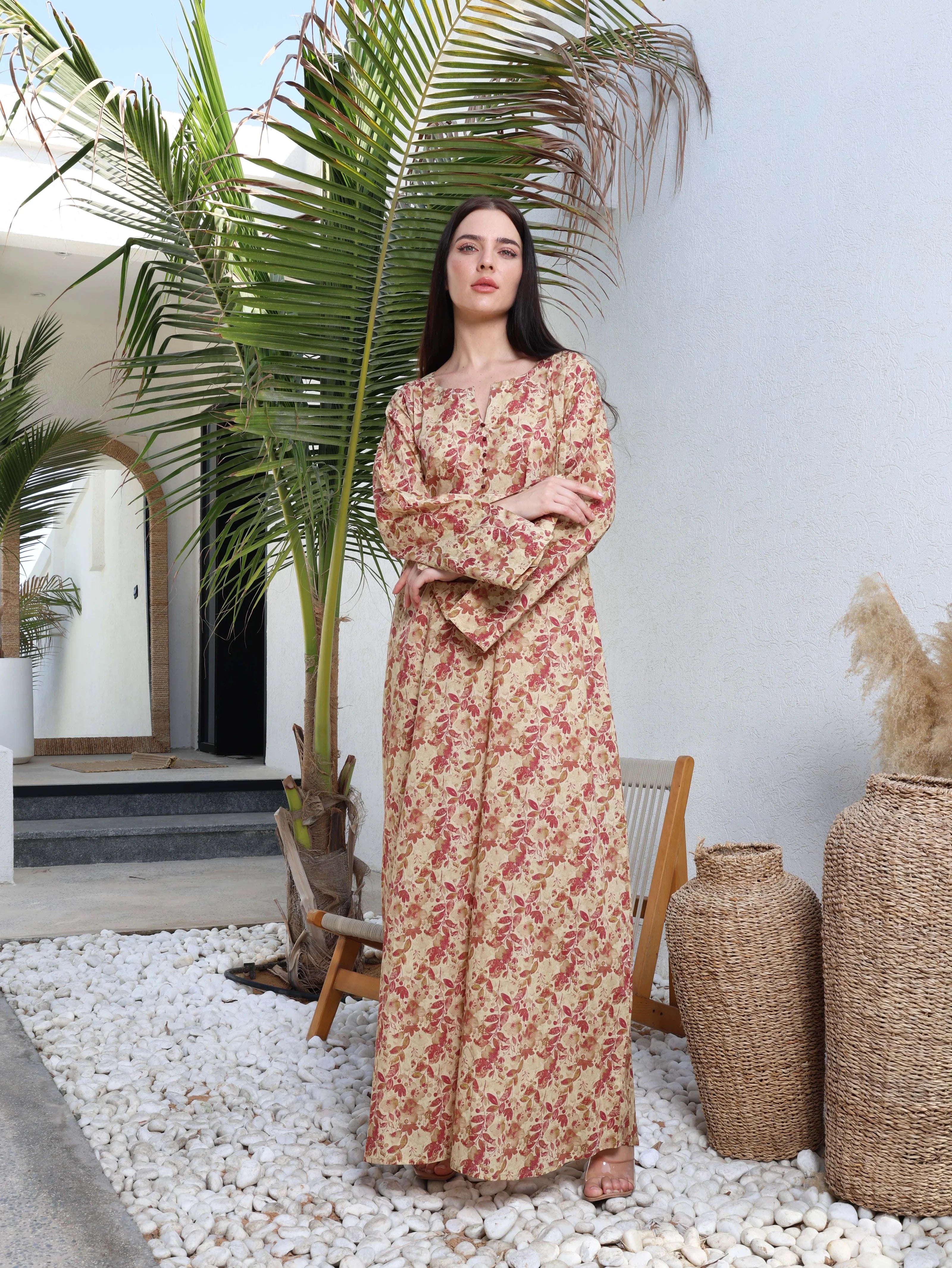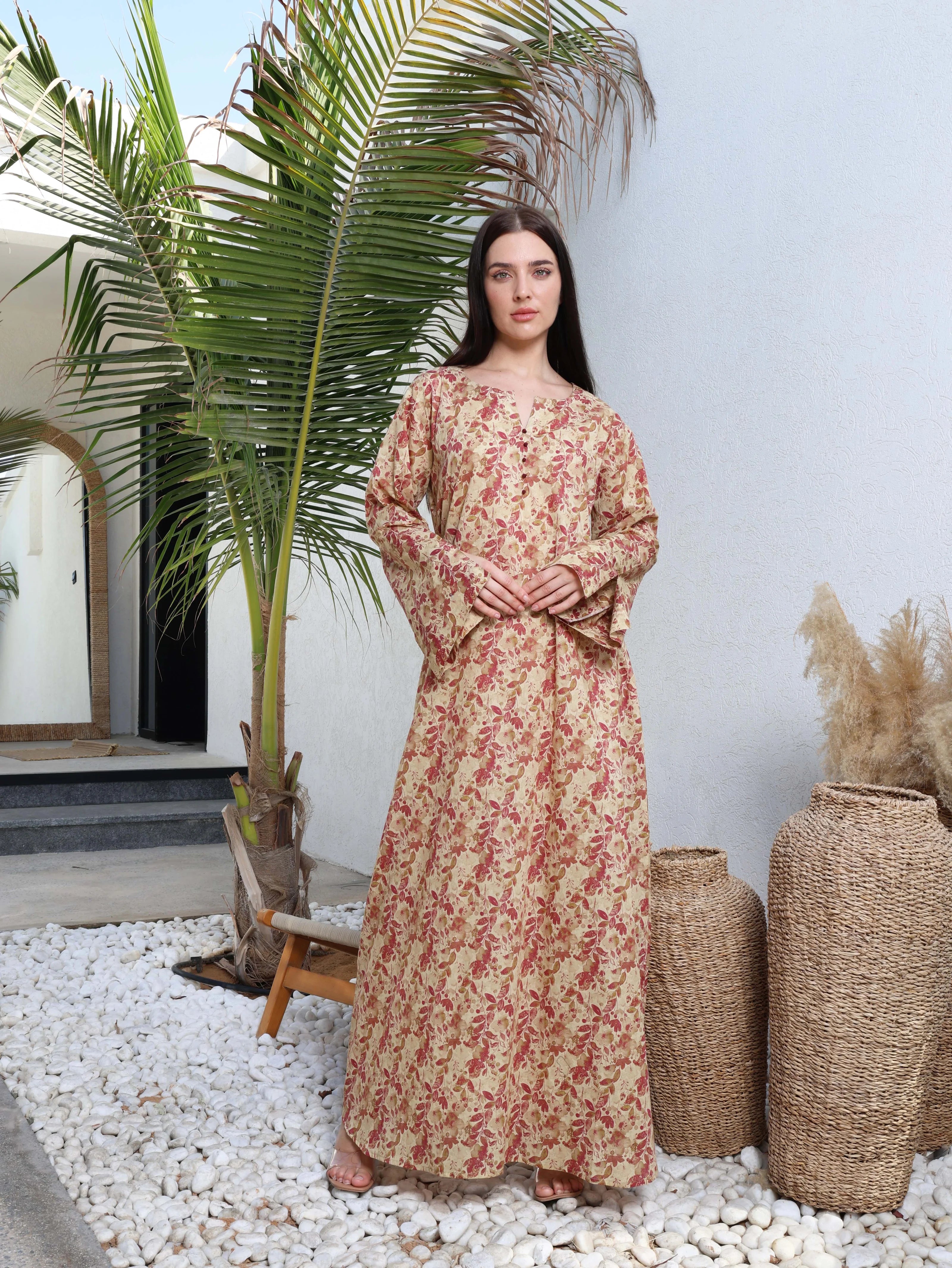 Embrace natural elegance with our Rustic Rose Jalabiya, beautifully crafted from soft and breathable Eastex cotton fabric. The design features a delicate vintage leaf print in warm shades of dusty maroon and beige, creating a classic, earthy charm that’s perfect for any occasion.