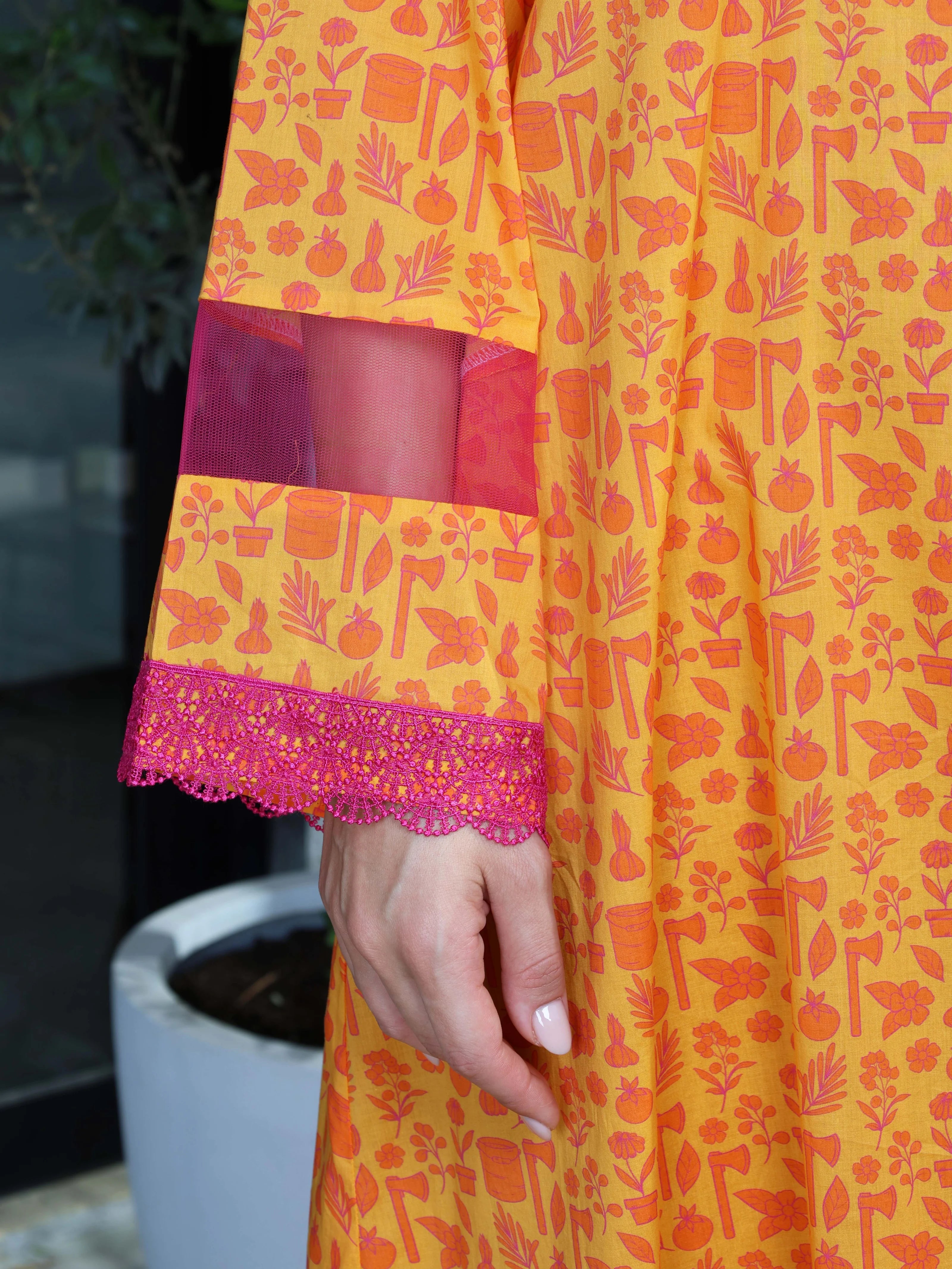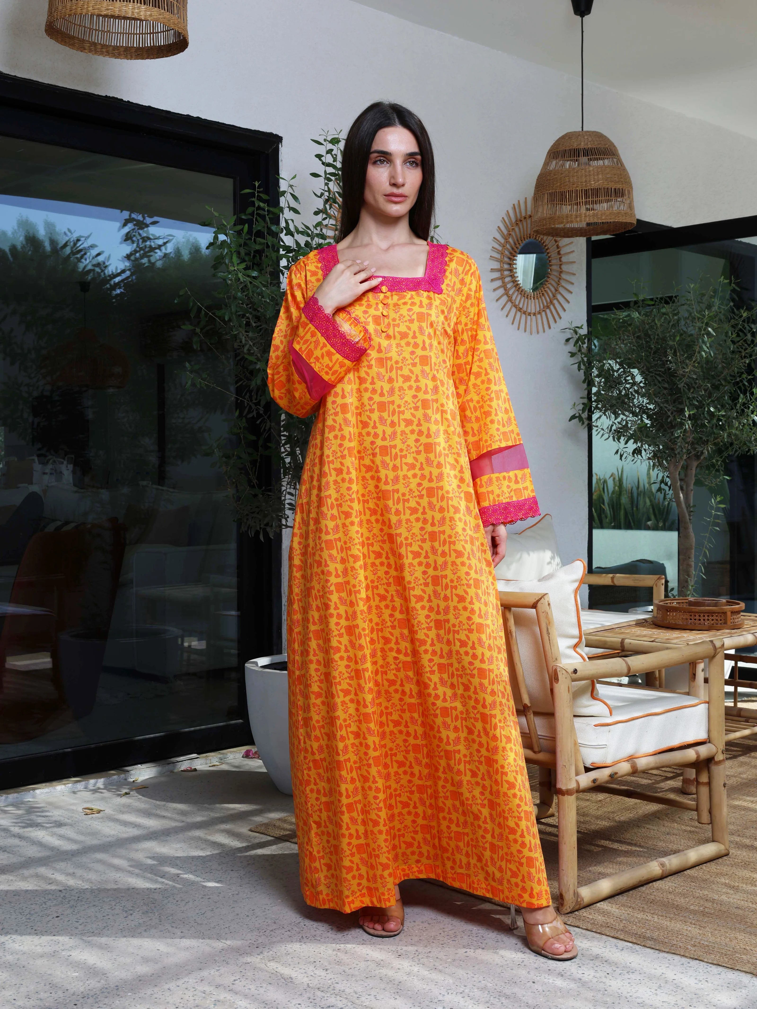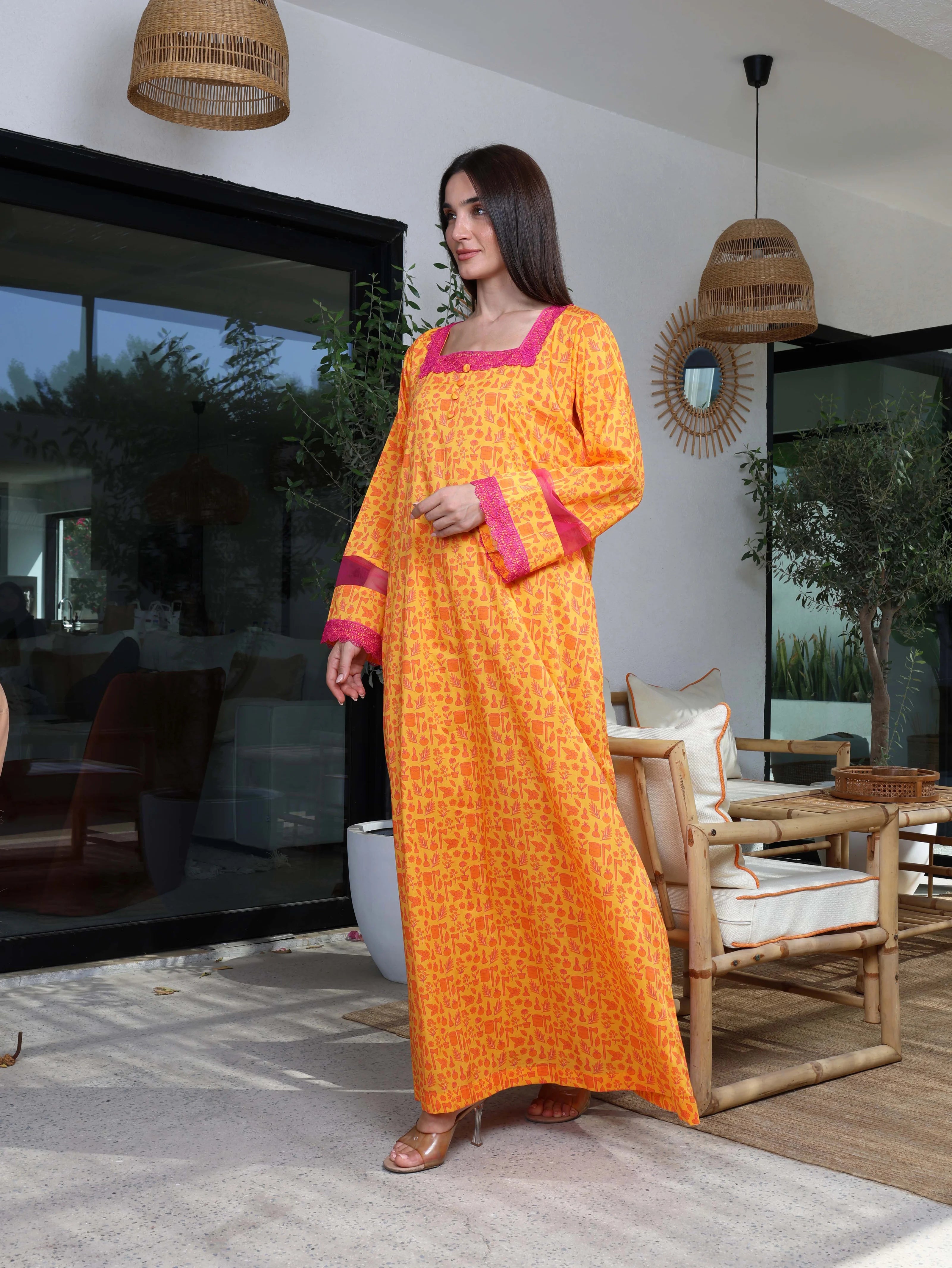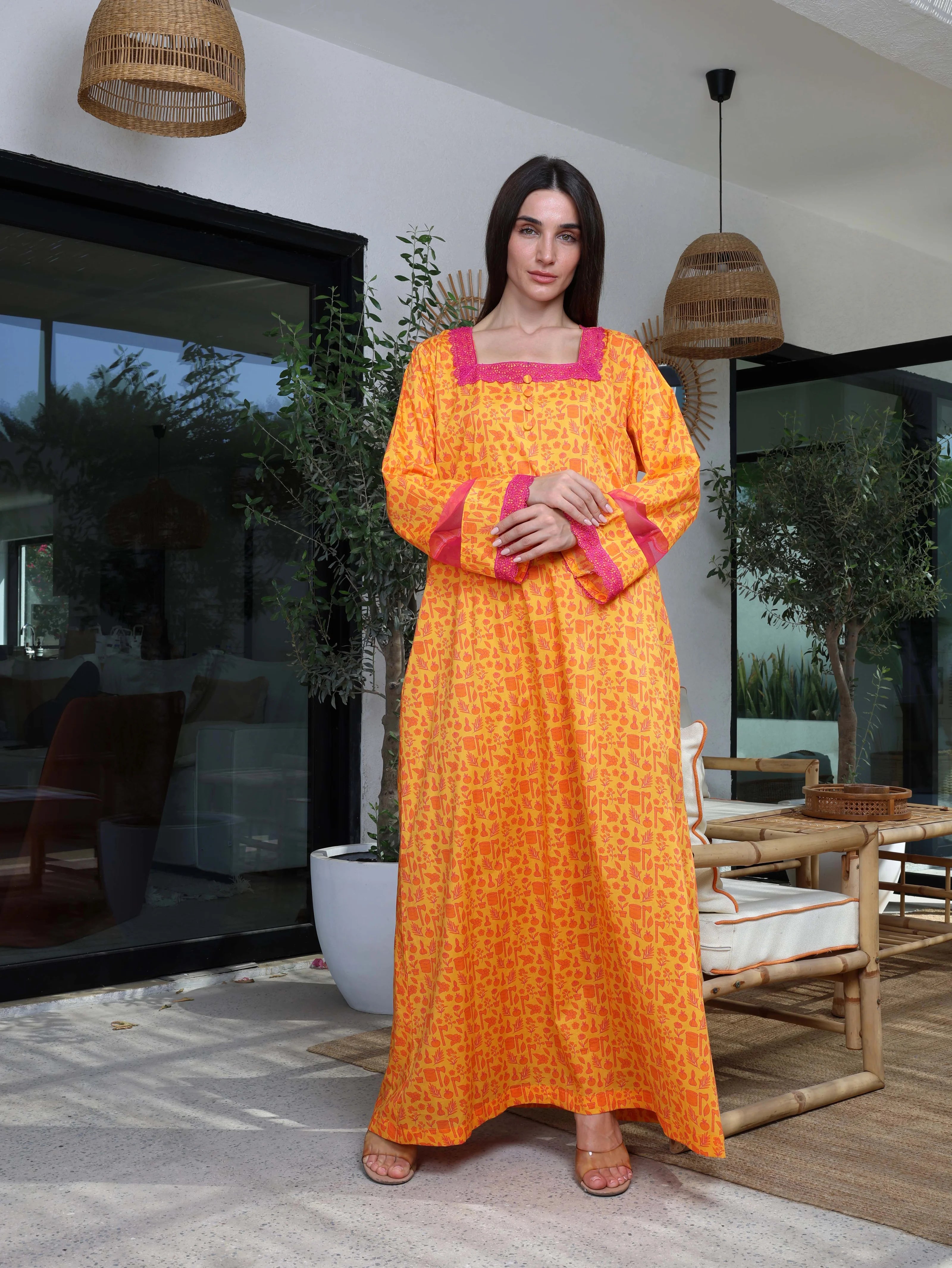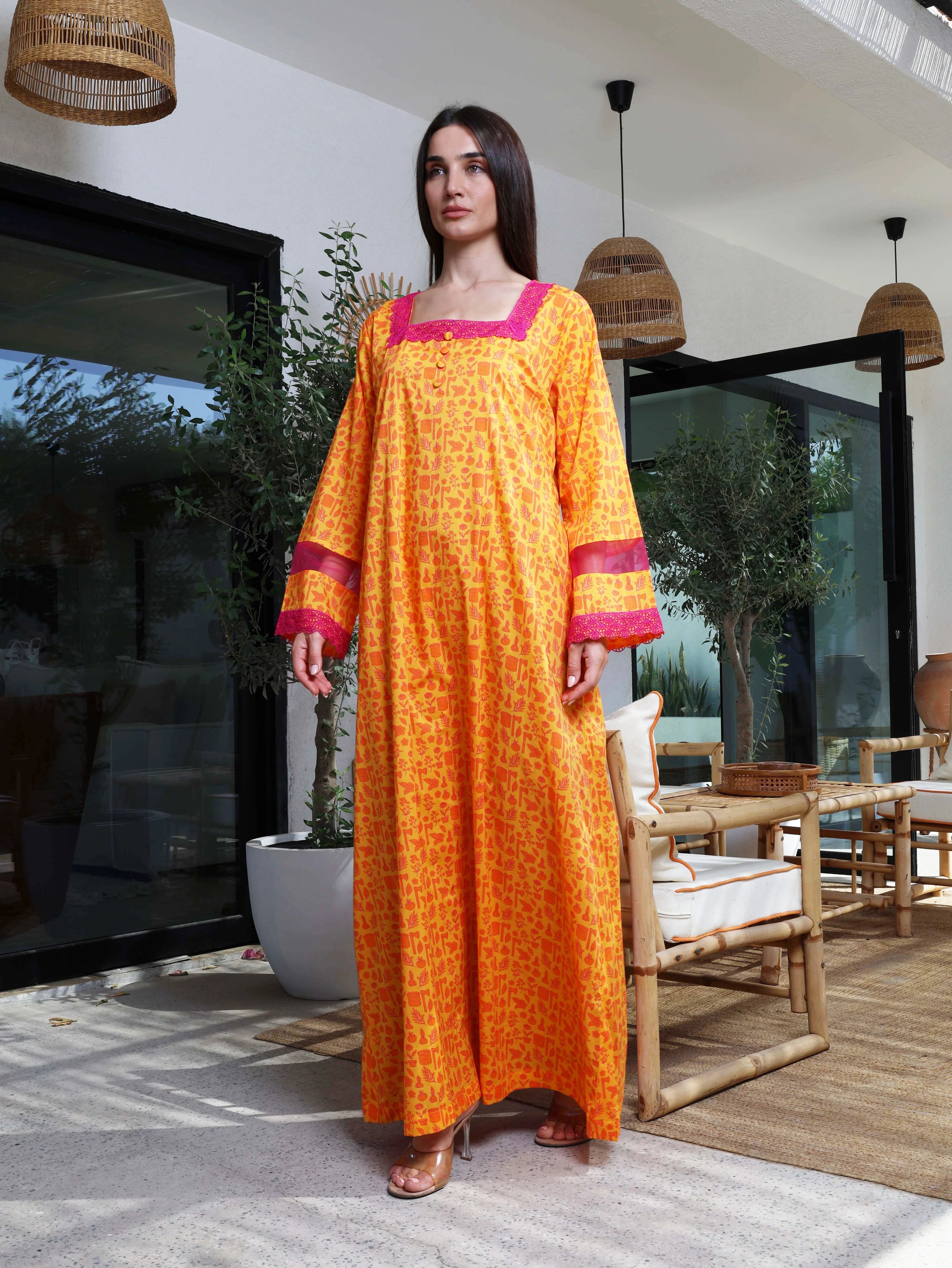 Radiate joy and warmth in our Saffron bloom Jalabiya, crafted from soft, breathable Eastex cotton fabric with a smooth lining inside for comfort and coverage. The cheerful sunny yellow base is playfully accented with coral-orange prints, while the neckline and cuffs are highlighted with vibrant magenta lace detailing for a feminine touch.