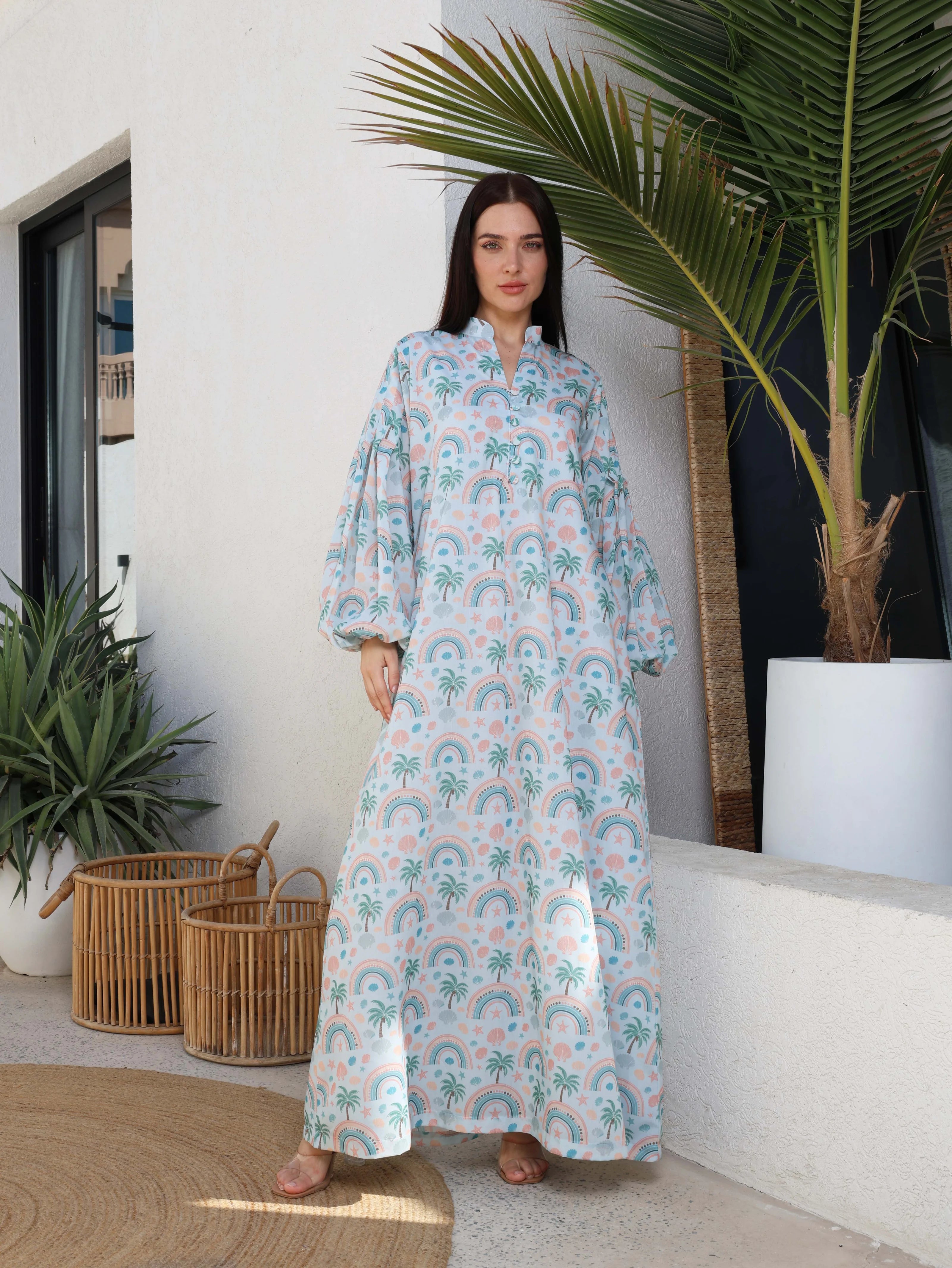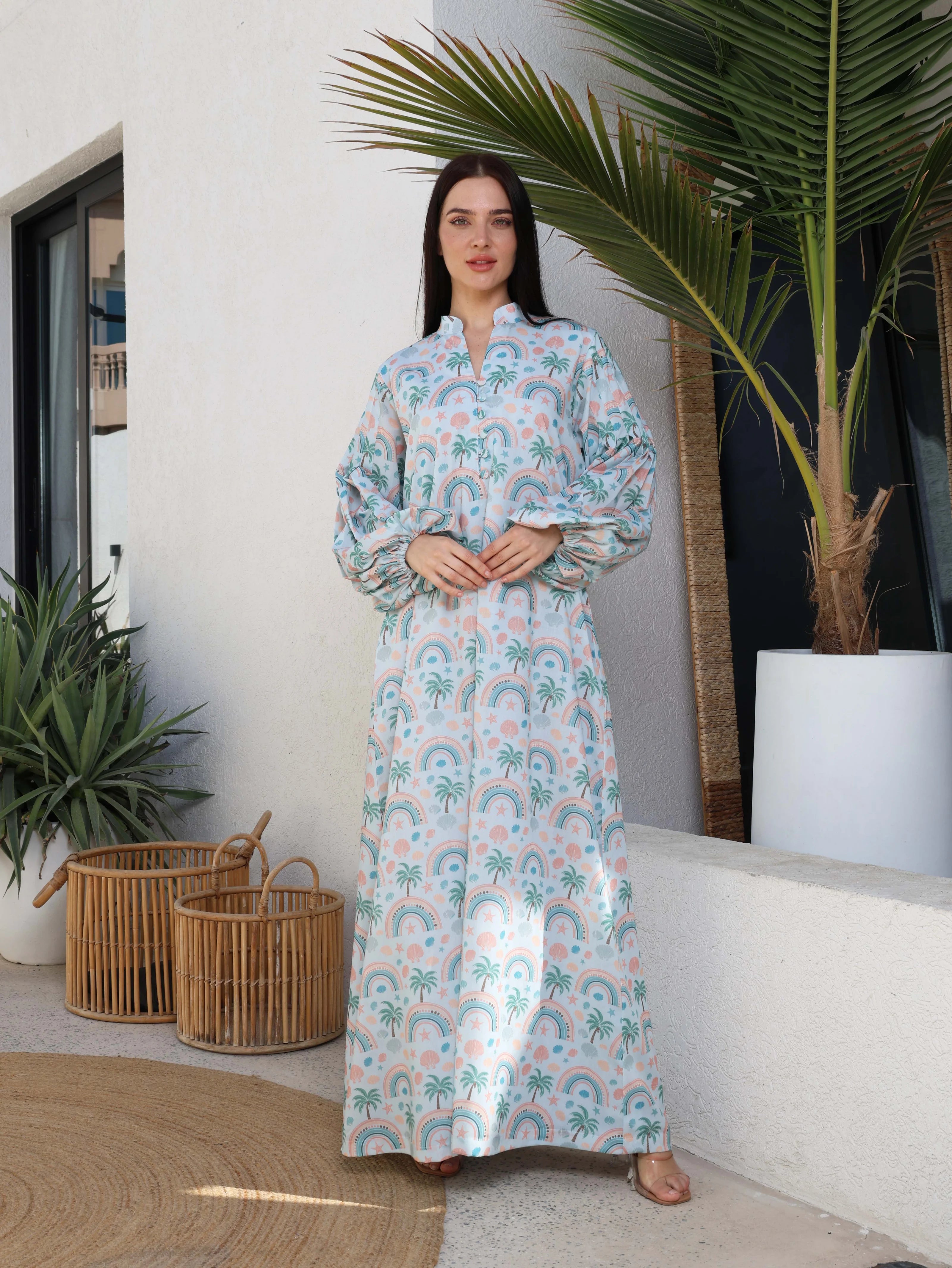 Step into effortless elegance with our Tropical Dream Jalabiya, featuring a refreshing pastel print of palm trees, seashells, and rainbows that embody the spirit of coastal charm. Crafted from soft, breathable premium Polyvoile fabric with a smooth inner lining for comfort and coverage, this piece is perfect for sunny days or relaxed gatherings. Designed in a medium size with a 58-inch length, it offers a graceful flow and an easy fit for a modest yet modern silhouette. The voluminous sleeves and playful print make it a perfect balance of comfort and chic.